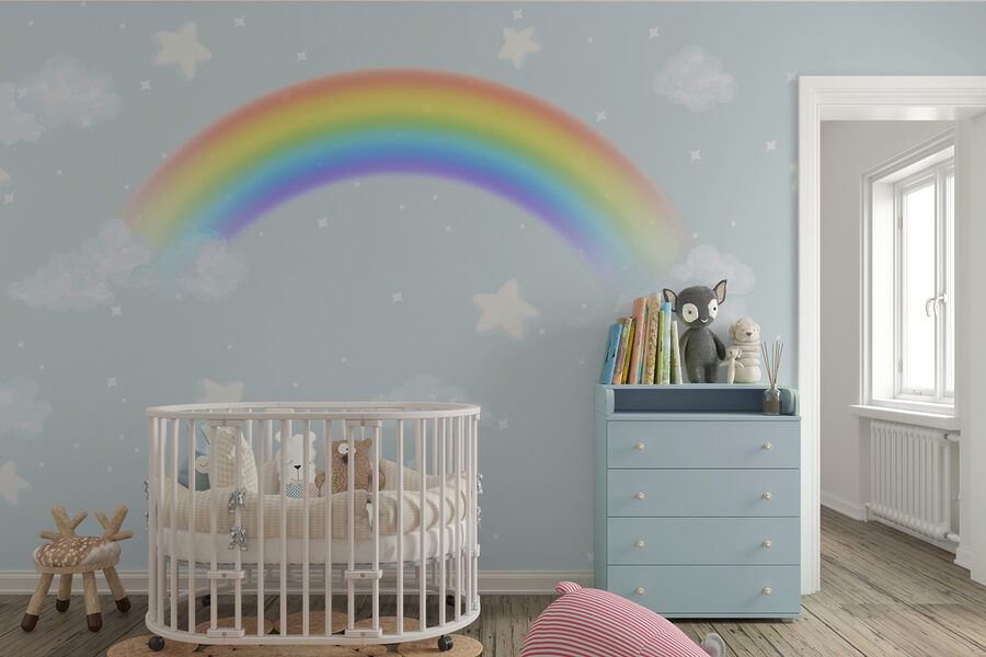 Predstavujeme nástennú maľbu “Biela hviezda na modrom pozadí” – ideálnu na premenu akéhokoľvek priestoru na rozmarné snenie. Predstavte si reakciu vášho dieťatka, keď uvidí túto nástennú maľbu pokrývajúcu celú stenu. Je to ako vstúpiť priamo do rozprávky, obklopený nadýchanými bielymi obláčikmi a tými rozkošnými hviezdičkami, ktoré akoby v noci blikali. Ideálna do detskej izby alebo detskej izby, je to ako kúsok oblohy namaľovaný len pre ne!