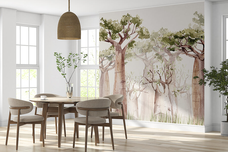 Ponorte sa do snovej krajiny s nástennou maľbou “Majestátne baobaby v akvarelovom lese” – ideálnou na premenu akéhokoľvek priestoru na rozmarný les. Predstavte si, že vojdete do miestnosti, kde vás tieto vysoké baobaby vítajú svojím jemným akvarelovým pôvabom. Deti by ju zbožňovali a cítili by sa ako mini bádatelia v bujnom, čarovnom lese. Jemné odtiene prinášajú útulnú prírodnú atmosféru a zároveň dodávajú trochu mystiky. Predstavte si detskú izbu alebo izbu na hranie premenenú na očarujúce útočisko; je to, akoby čas na rozprávky práve dostal upgrade. Mäkká zelená a zemité tóny sú mimoriadne upokojujúce, takže sú ideálne pre čitateľský kútik alebo aj ako pozadie pre každodennú relaxáciu. Je to to pravé pre každého, kto chce do svojho domova vniesť nádych tropov a štipku kreativity. Pripravte sa na všetky komplimenty a možno aj na pár “ooh” a “aah”!