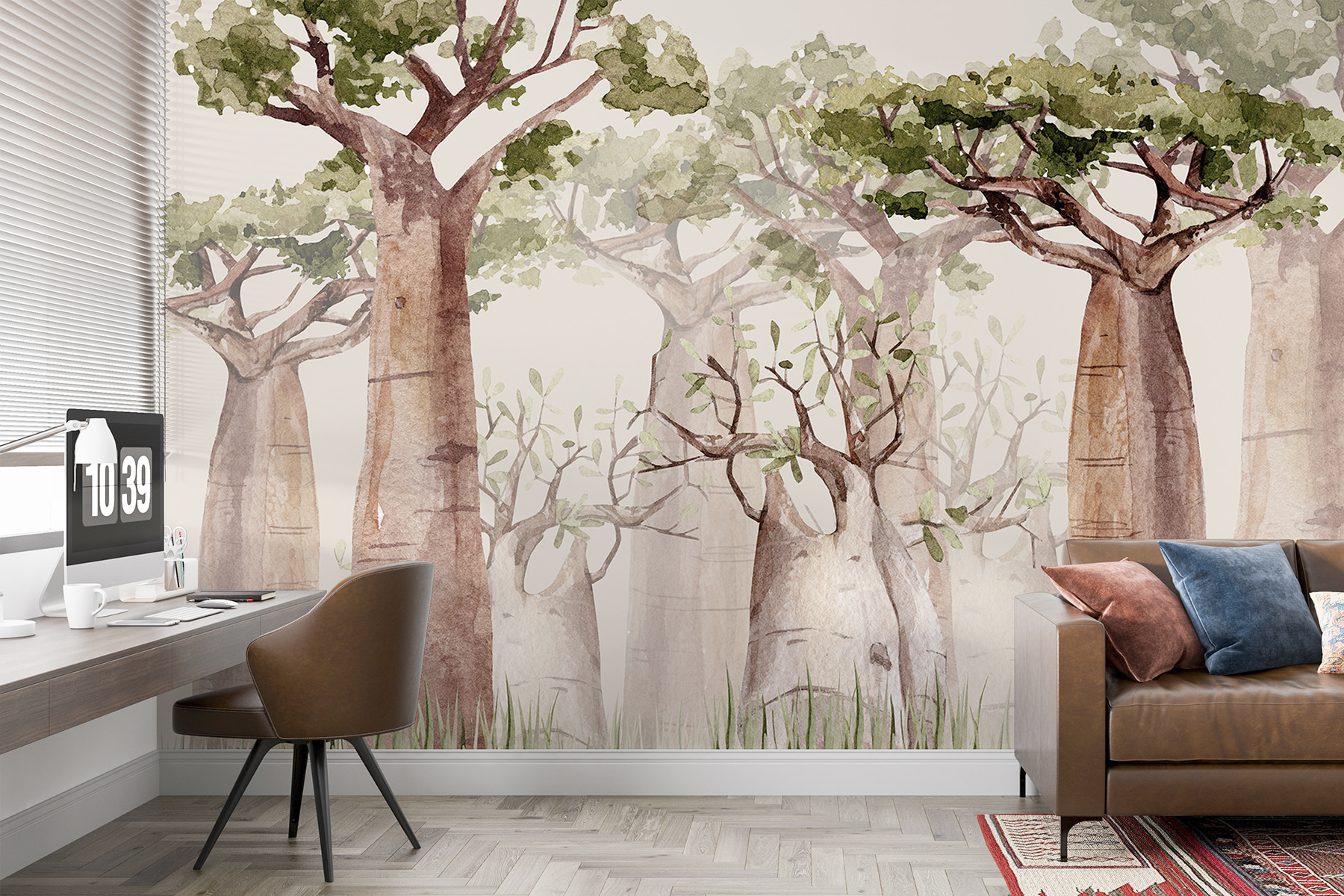 Ponorte sa do snovej krajiny s nástennou maľbou “Majestátne baobaby v akvarelovom lese” – ideálnou na premenu akéhokoľvek priestoru na rozmarný les. Predstavte si, že vojdete do miestnosti, kde vás tieto vysoké baobaby vítajú svojím jemným akvarelovým pôvabom. Deti by ju zbožňovali a cítili by sa ako mini bádatelia v bujnom, čarovnom lese. Jemné odtiene prinášajú útulnú prírodnú atmosféru a zároveň dodávajú trochu mystiky. Predstavte si detskú izbu alebo izbu na hranie premenenú na očarujúce útočisko; je to, akoby čas na rozprávky práve dostal upgrade. Mäkká zelená a zemité tóny sú mimoriadne upokojujúce, takže sú ideálne pre čitateľský kútik alebo aj ako pozadie pre každodennú relaxáciu. Je to to pravé pre každého, kto chce do svojho domova vniesť nádych tropov a štipku kreativity. Pripravte sa na všetky komplimenty a možno aj na pár “ooh” a “aah”!