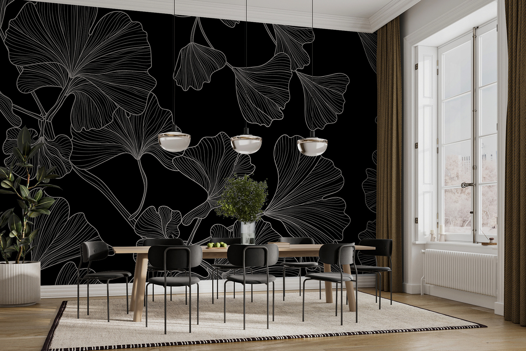 Premeňte svoj priestor pomocou tejto úžasnej nástennej maľby s elegantným vzorom ginka, ktorý určite upúta pozornosť. Predstavte si to – tieto pôvabné listy víriace na hlbokom čiernom pozadí okamžite dodajú šarm a nádych prírody každej miestnosti. Je to ako priniesť do interiéru závan čerstvého vzduchu, samozrejme, bez peľu. Predstavte si príjemné večery strávené obdivovaním tohto nádherného dizajnu, možno so šálkou teplého čaju. Je ideálny pre každého, kto chce svojmu interiéru dodať jedinečný nádych. Dôverujte ginko, ktoré na vaše steny prinesie trochu pokoja a umeleckého zážitku!