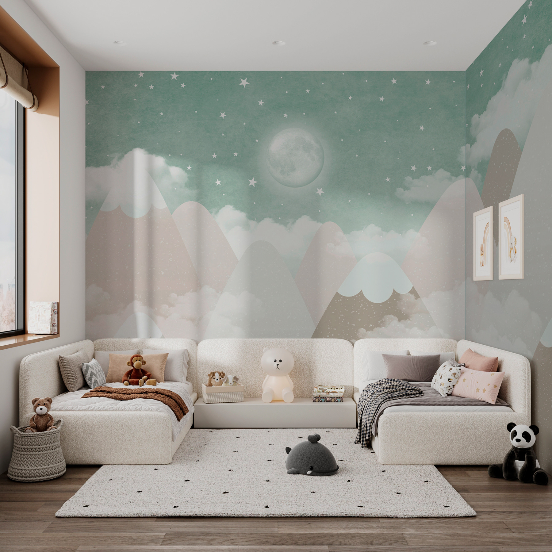Jemné farby a rozmarné tvary hôr prinášajú upokojujúcu atmosféru. V tejto pokojnej scéne, kde mesiac visí ako nežný strážca a dohliada na váš spánok, sa môžete ľahko stratiť. Hviezdy – ach, tie hviezdy! Jemne sa trblietajú a vyvolávajú malé okamihy úžasu. Vážne, len si predstavte čas rozprávania alebo spánku pri tejto očarujúcej kulise!