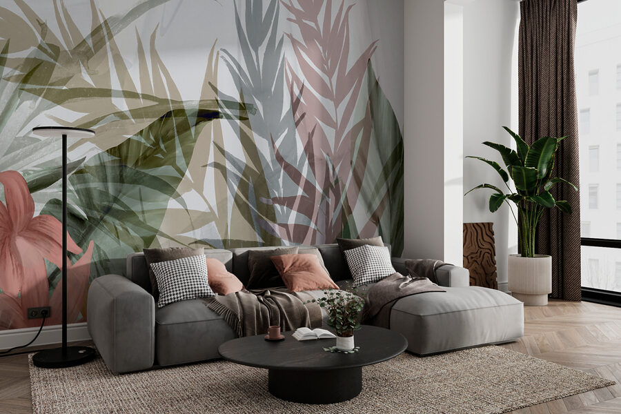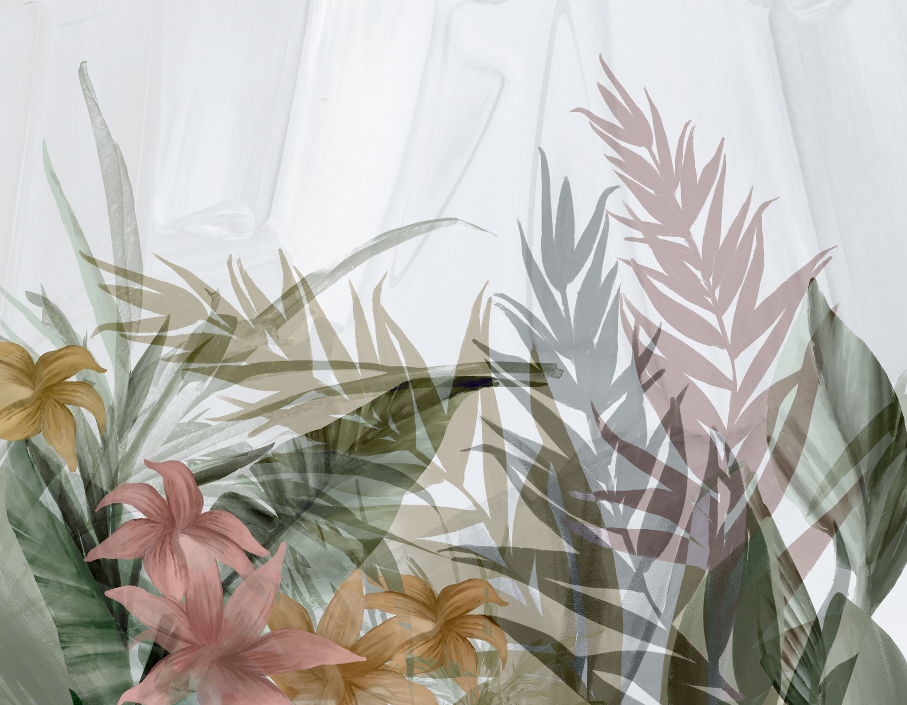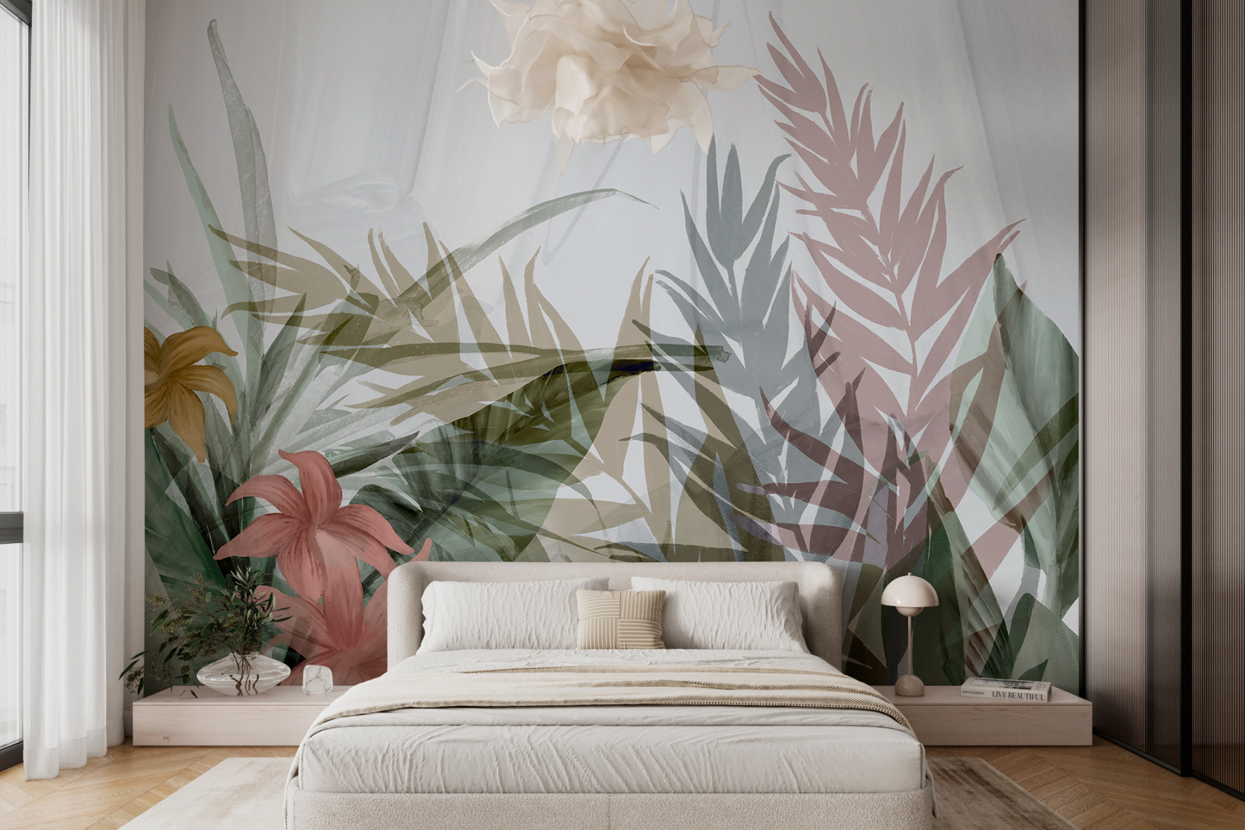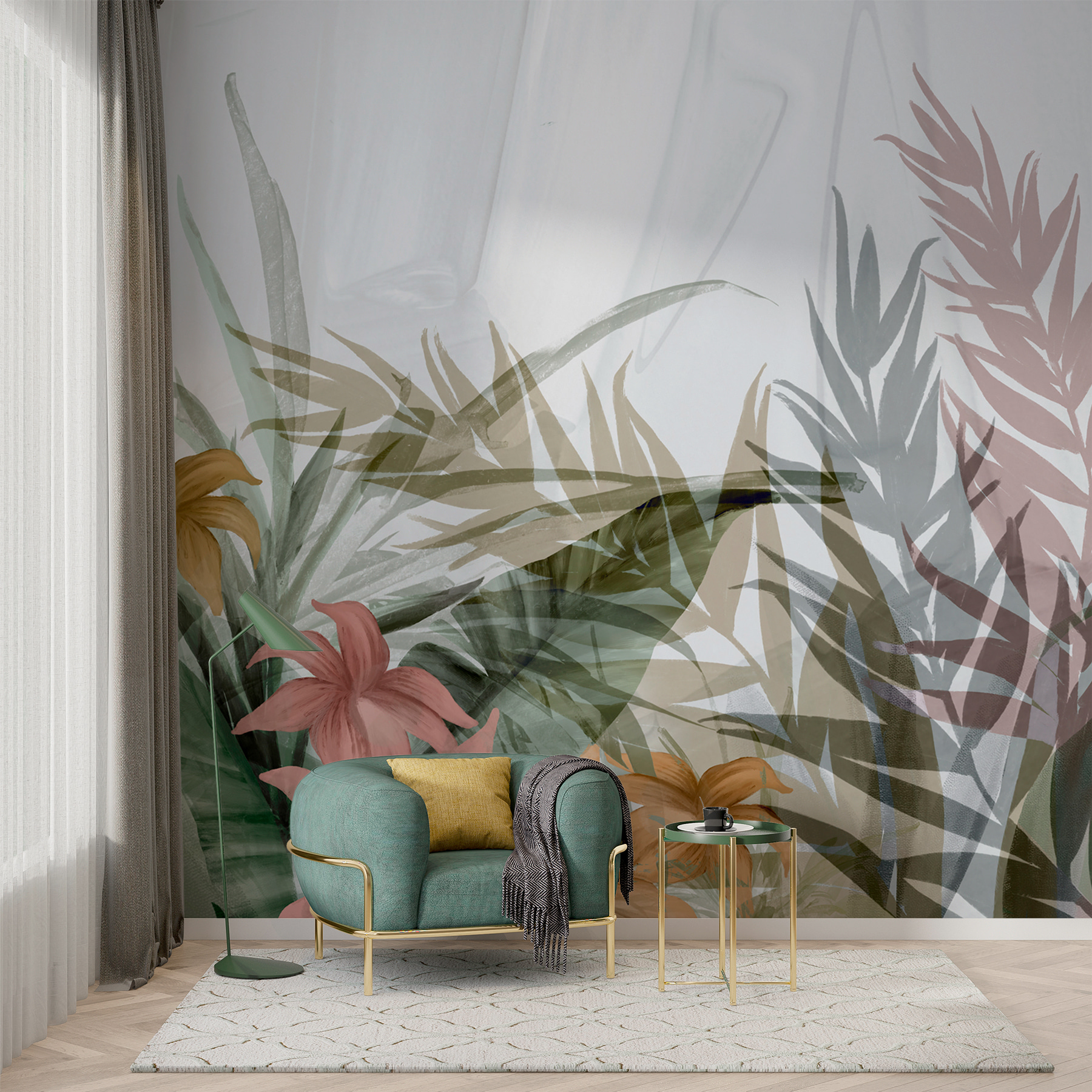 Predstavte si toto: nástenná maľba, ktorá premení vašu stenu na pokojnú oázu. Predstavujeme vám náš abstraktný kvetinový dizajn s vrstvenými listami. Je to ako minivakácia zakaždým, keď vojdete do miestnosti. Tie jemné vrstvy listov a kvetov – takmer ako jemný vánok šumiaci tropickým lesom. Tlmené farby sa spájajú v upokojujúcom tanci, vďaka ktorému sa každý priestor cíti sviežo a pokojne.