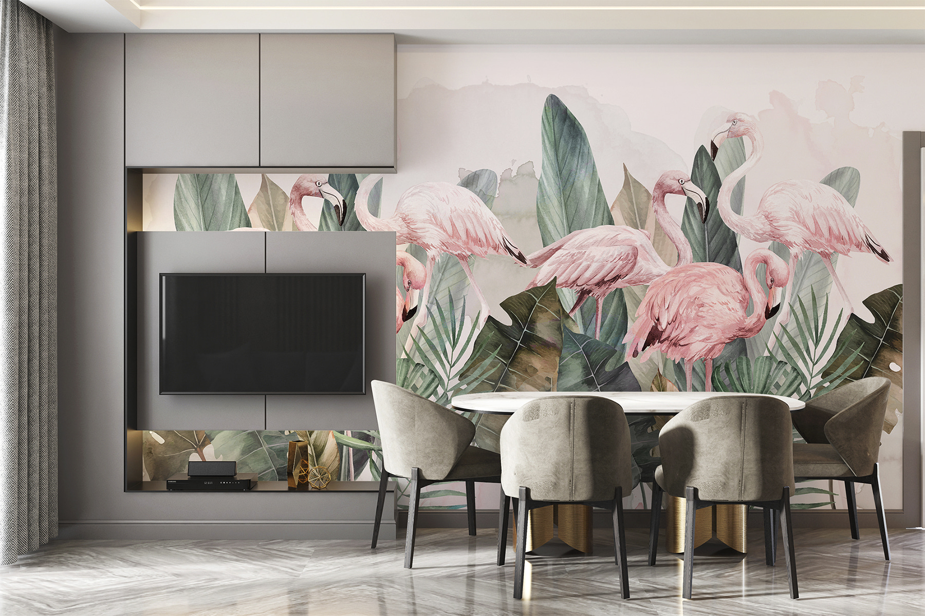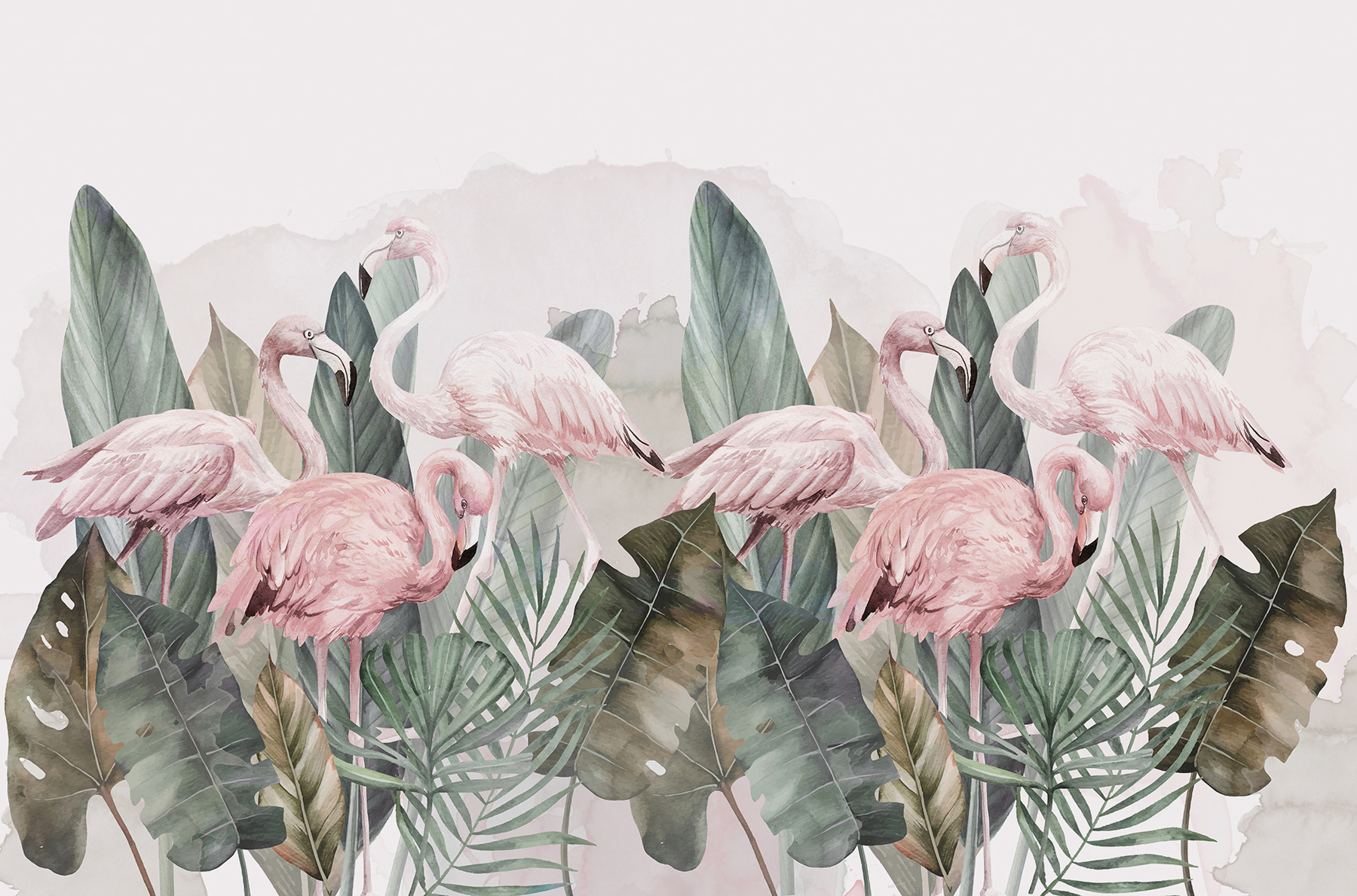 Jemná ružová a zelená pôsobia upokojujúco. Je to ako preniesť si kúsok džungle priamo k vám domov, bez hmyzu! Táto nástenná maľba vie urobiť dojem, či už si chcete vyzdobiť spálňu, dodať intrigy do kancelárie alebo vytvoriť hravý priestor pre deti. Navyše, kto by nemal rád plameniaky? Sú nepredvídateľné, zábavné a jednoducho nádherné.