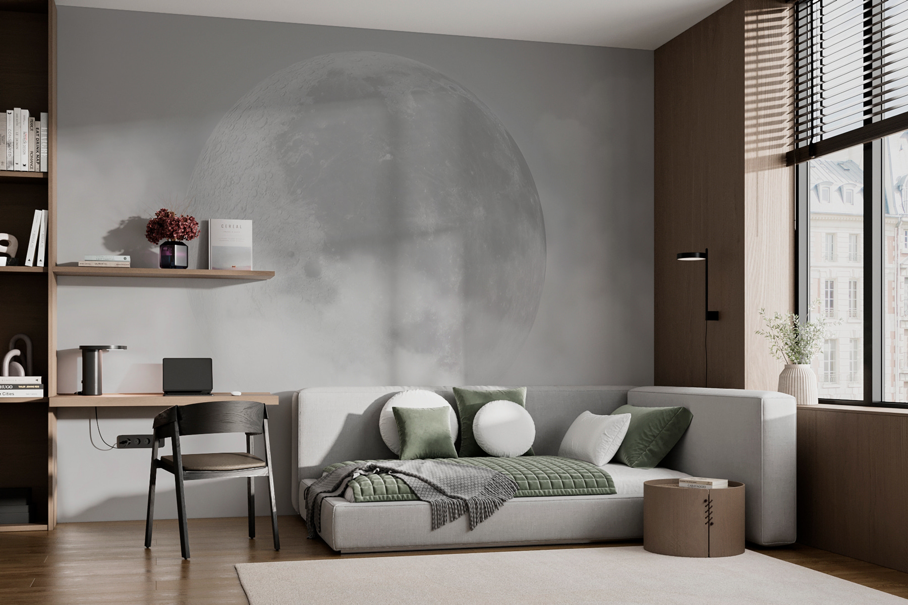 Táto nástenná maľba je ideálna na stenu v spálni alebo v útulnom čitateľskom kútiku a zahalí vás do jemnej, pokojnej žiary. Detaily sú ohromujúce; takmer máte pocit, že by ste mohli natiahnuť ruku a dotknúť sa mesačných kráterov! Je to pravda – kúsok galaxie priamo u vás doma. Či už ste pozorovateľ hviezd, alebo len niekto, kto má rád nádych rozmarnosti, je to dokonalý únik bez toho, aby ste museli vyjsť von. Jemná kombinácia svetla a tieňa z neho robí univerzálny kúsok, ktorý sa bez námahy hodí do rôznych tém – od modernej elegancie až po rustikálny šarm.