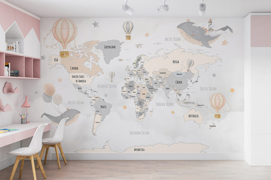 Premeňte akúkoľvek miestnosť na zasnený útek s touto očarujúcou fototapetou s mapou sveta posiatou rozmarnými teplovzdušnými balónmi a hravými veľrybami. Predstavte si, ako sa vaši malí dobrodruhovia pozerajú na tento očarujúci dizajn, ktorý podnecuje ich predstavivosť a sny o ďalekých miestach. Jemné farby vytvárajú upokojujúcu atmosféru, ktorá je ideálna do detskej izby alebo herne. Je to ako jemná pripomienka, aby ste objavovali svet – aj keď len prostredníctvom denných snov. Kto by nechcel, aby ho plávajúca veľryba viedla za novými dobrodružstvami? Nechajte túto nástennú maľbu inšpirovať zábavné príbehy a nekonečnú kreativitu vo vašom priestore.