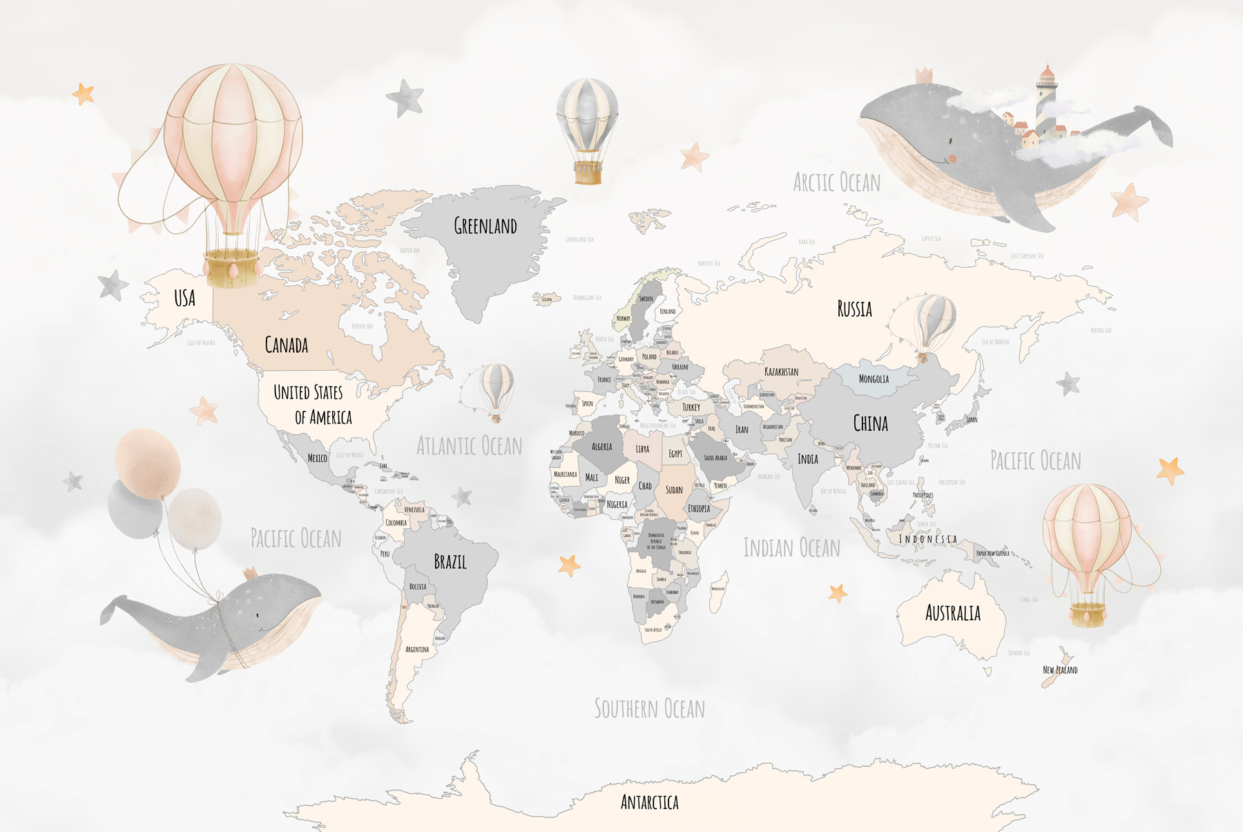 Premeňte akúkoľvek miestnosť na zasnený útek s touto očarujúcou fototapetou s mapou sveta posiatou rozmarnými teplovzdušnými balónmi a hravými veľrybami. Predstavte si, ako sa vaši malí dobrodruhovia pozerajú na tento očarujúci dizajn, ktorý podnecuje ich predstavivosť a sny o ďalekých miestach. Jemné farby vytvárajú upokojujúcu atmosféru, ktorá je ideálna do detskej izby alebo herne. Je to ako jemná pripomienka, aby ste objavovali svet – aj keď len prostredníctvom denných snov. Kto by nechcel, aby ho plávajúca veľryba viedla za novými dobrodružstvami? Nechajte túto nástennú maľbu inšpirovať zábavné príbehy a nekonečnú kreativitu vo vašom priestore.