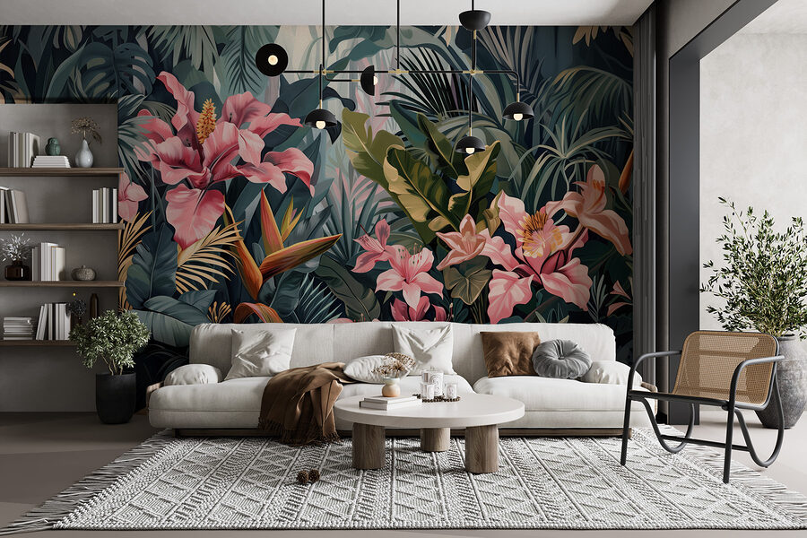 Predstavte si, že prídete domov po dlhom dni, vyzujete si topánky a priamo v obývačke vás privíta svieža džungľa. Presne to prináša táto živá nástenná maľba. Je to ako vstúpiť do tropického raja – plného výrazných ružových kvetov a bohatej zelene – bez toho, aby ste museli opustiť svoj dom! Ideálna na dodanie významného wow faktora akémukoľvek priestoru, či už ide o obývaciu izbu, spálňu, alebo dokonca elegantnú domácu kanceláriu.
