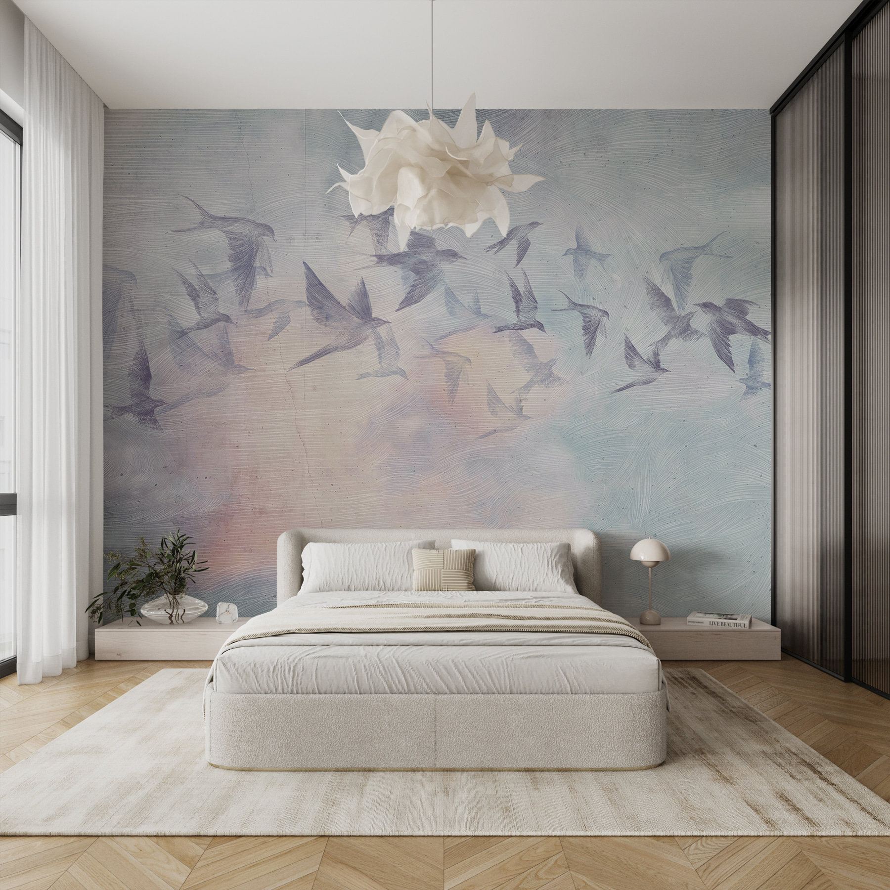 Či už popíjate rannú kávu, alebo sa lúčite s dobrou knihou, táto nástenná maľba dodá vášmu dňu nádych pokoja. Navyše nádych rozmarnosti nikdy nevyjde z módy. Tak prečo sa nenechať týmito akvarelovými zázrakmi preniesť na miesto, kde je obloha vždy pokojná a vtáky sú vždy v lete?