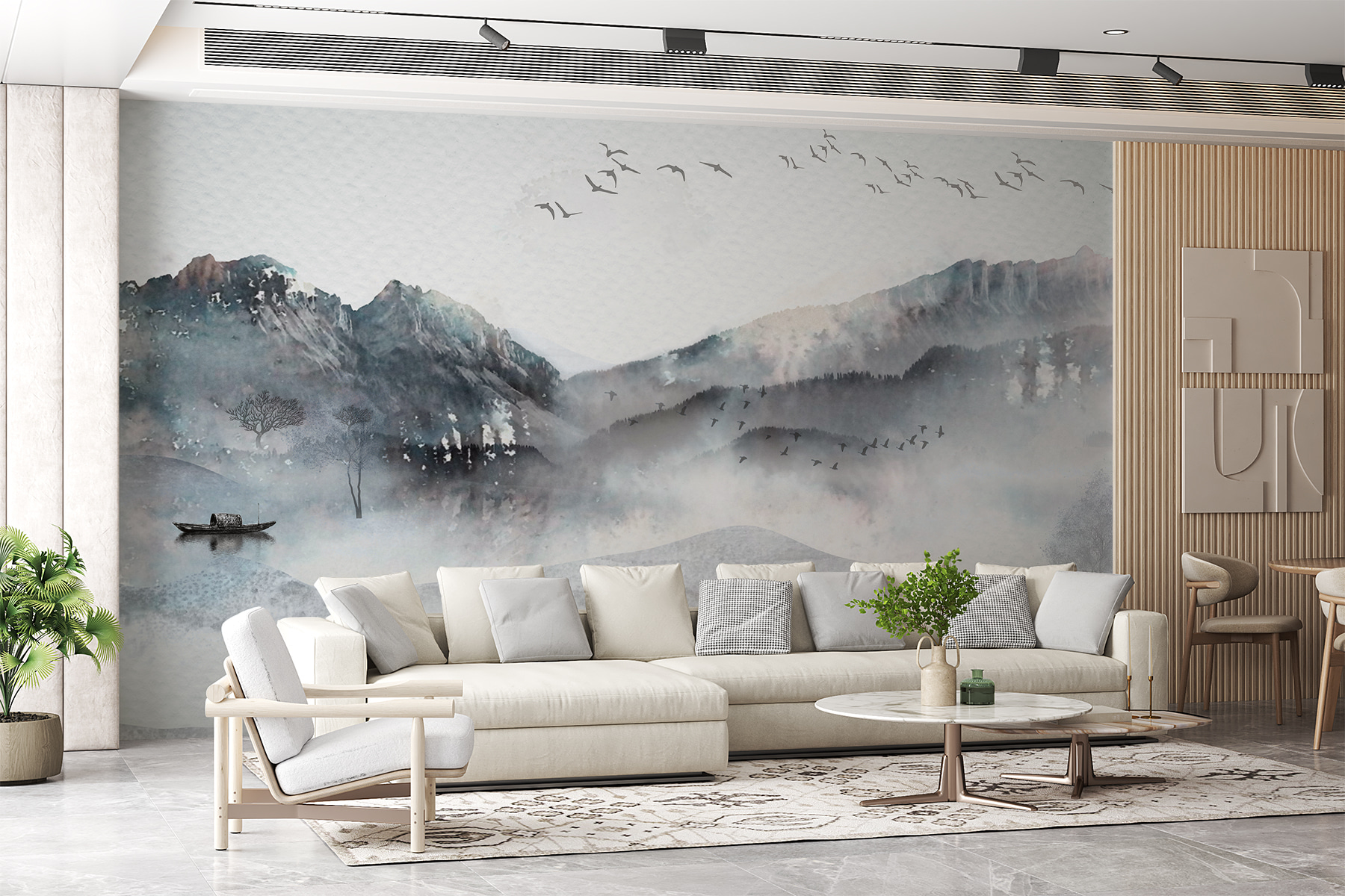 Predstavte si, že vstúpite do miestnosti a privíta vás pokojná skupina vtákov vznášajúcich sa na zasnenej oblohe, ktorá sa vznáša vysoko nad hmlistou lesnou krajinou. Táto akvarelová nástenná maľba nie je len umením – je to zážitok. Upokojujúca hmla, mäkké kopce a vzdialené hory – ako jemný šepot prírody. Akoby ste počuli šepot stromov a cítili chladný, svieži ranný vzduch, ktorý sa vám otiera o pokožku.