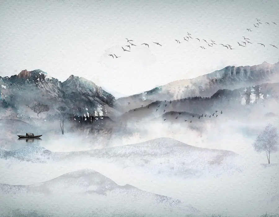 Predstavte si, že vstúpite do miestnosti a privíta vás pokojná skupina vtákov vznášajúcich sa na zasnenej oblohe, ktorá sa vznáša vysoko nad hmlistou lesnou krajinou. Táto akvarelová nástenná maľba nie je len umením – je to zážitok. Upokojujúca hmla, mäkké kopce a vzdialené hory – ako jemný šepot prírody. Akoby ste počuli šepot stromov a cítili chladný, svieži ranný vzduch, ktorý sa vám otiera o pokožku.