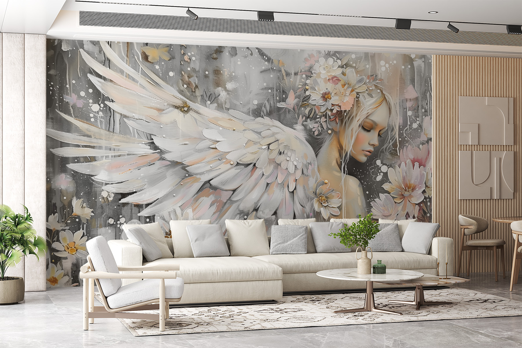 Premeňte akýkoľvek priestor pomocou tejto očarujúcej nástennej maľby, na ktorej je zobrazená žena s úžasnými krídlami obklopená jemnými kvetmi. Predstavte si, že vojdete do miestnosti a máte pocit, že ste vstúpili do rozmarného snenia. Je to, akoby sa príroda a fantázia stretli tým najkrajším spôsobom.