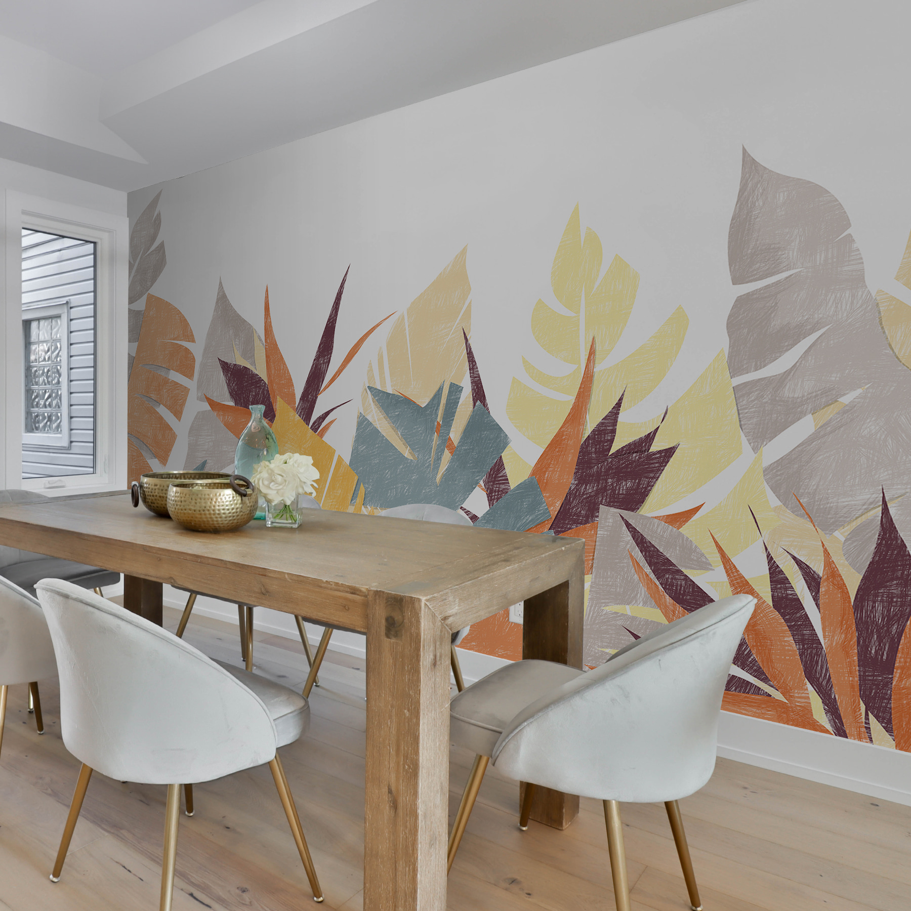 Či už máte radi prírodu, tropické vibrácie, alebo len chcete niečo oveľa viac cool ako obyčajné steny, táto nástenná maľba vás dostane. Je hravá a zároveň sofistikovaná – je to farebná spŕška bez toho, aby bola krikľavá. Navyše, na tých teplých oranžových, chladných modrých a zemitých tónoch je niečo, čo vám navodí útulný pocit. Je to ako tropický prales na plátne umelca – ideálne na to, aby ste každú miestnosť premenili z fádnej na úžasnú.