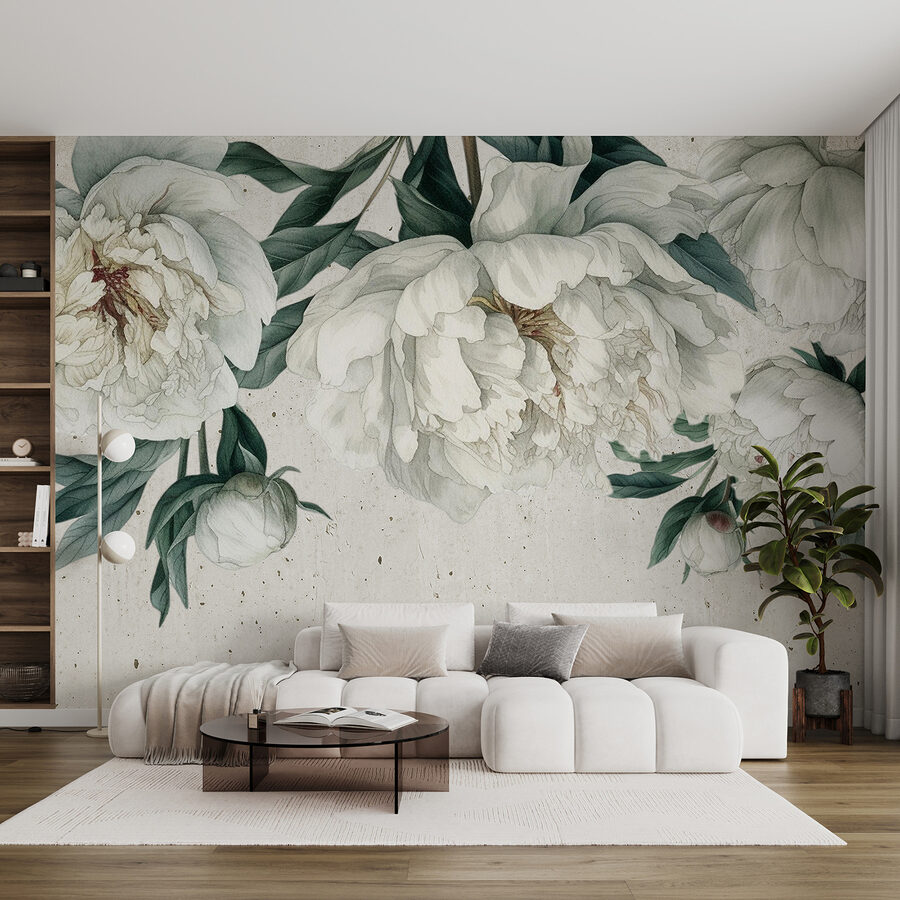 Premeňte akúkoľvek miestnosť pomocou tejto krásnej nástennej maľby s bielymi pivonkami zasadenými medzi svieže zelené listy. Predstavte si, že vstúpite do svojho priestoru a budete mať pocit, že ste sa práve zatúlali do pokojnej záhrady – aká krásna atmosféra! Táto fototapeta nie je len dekoračným prvkom; rozpráva príbeh elegancie a pokoja. Jemné okvetné lístky takmer šepkajú o relaxácii, takže je ideálna pre útulný čitateľský kútik alebo príjemnú obývačku.