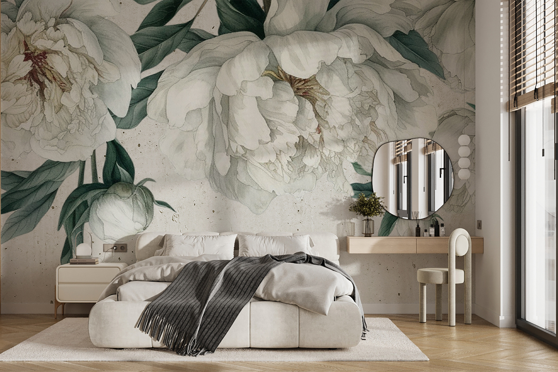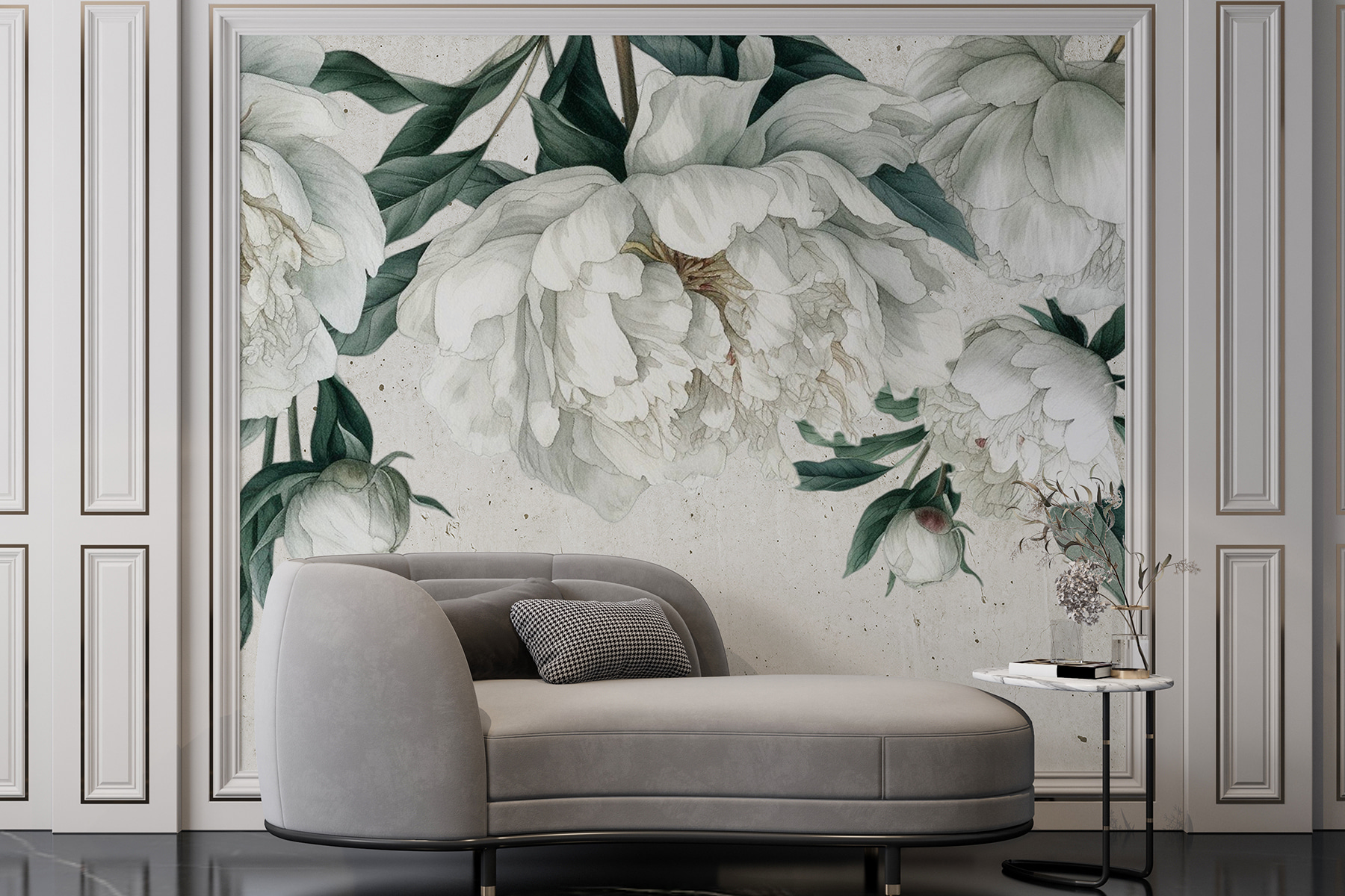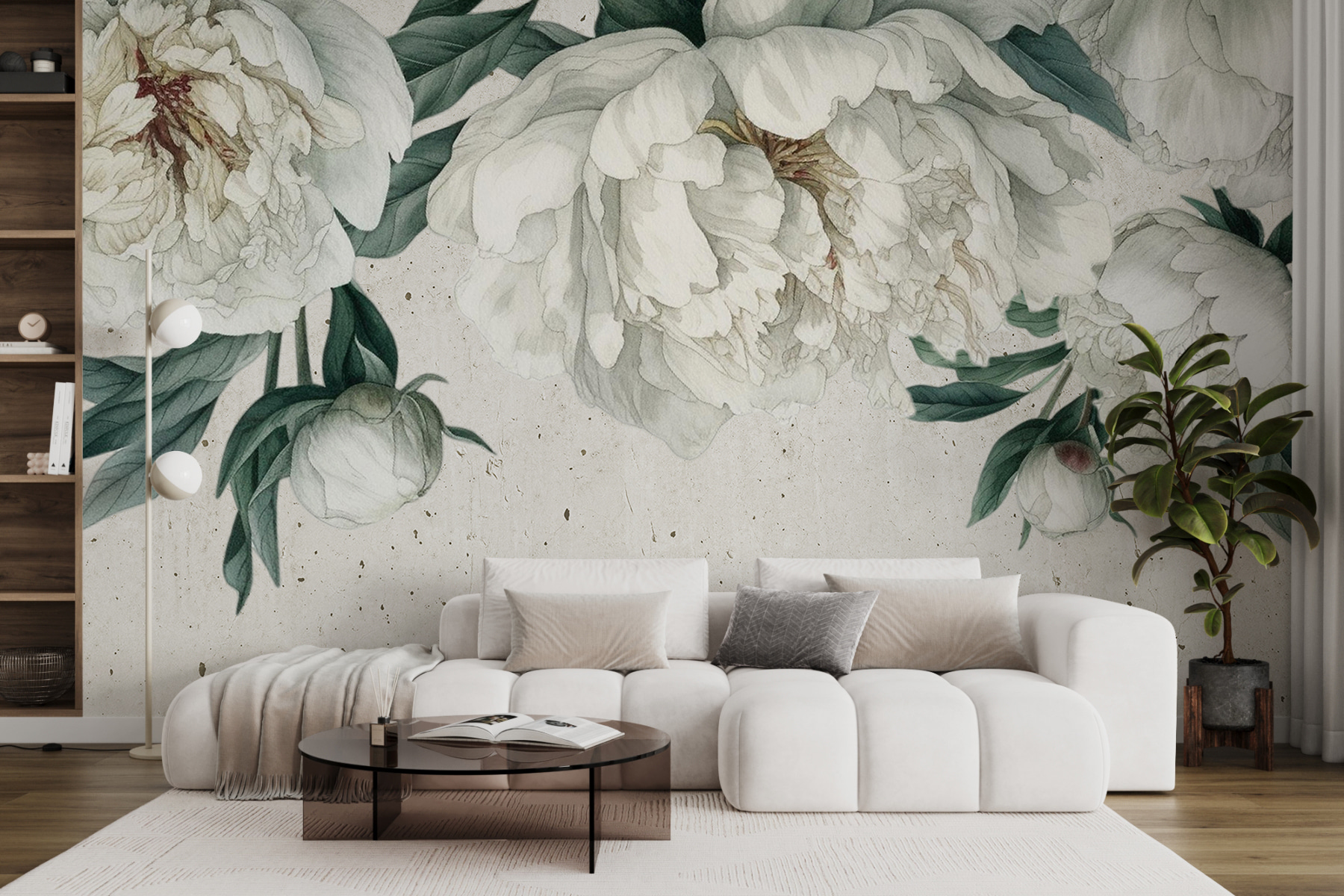 Premeňte akúkoľvek miestnosť pomocou tejto krásnej nástennej maľby s bielymi pivonkami zasadenými medzi svieže zelené listy. Predstavte si, že vstúpite do svojho priestoru a budete mať pocit, že ste sa práve zatúlali do pokojnej záhrady – aká krásna atmosféra! Táto fototapeta nie je len dekoračným prvkom; rozpráva príbeh elegancie a pokoja. Jemné okvetné lístky takmer šepkajú o relaxácii, takže je ideálna pre útulný čitateľský kútik alebo príjemnú obývačku.