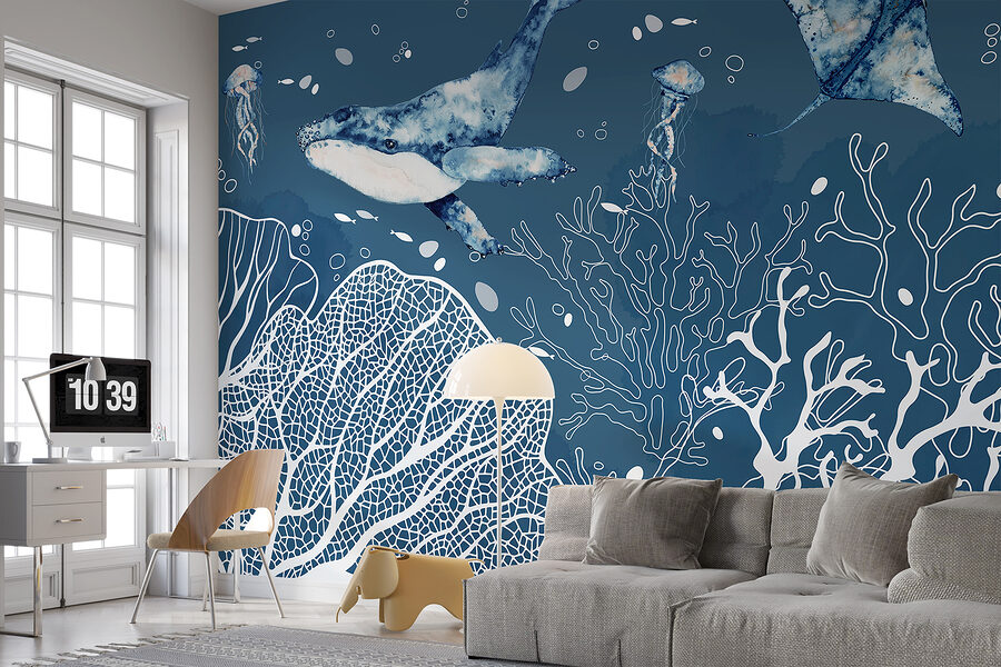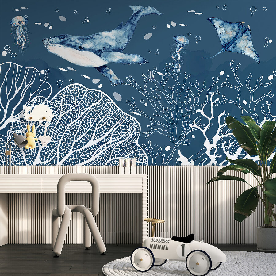 Ponorte sa do pokojných, fascinujúcich hlbín oceánu s nástennou maľbou “Podvodné divy hlbokého mora”. Táto fototapeta s očarujúcim výjavom veľrýb, ladných rají a zvedavých medúz premení každý priestor na pokojný morský raj. Predstavte si upokojujúce modré odtiene a zložité vodné detaily, ktoré oživia vašu izbu! Je ideálna na to, aby ste si na stenu pridali trochu úniku – je to takmer ako šnorchlovanie bez namočenia. Skvelý výber pre milovníkov oceánu alebo pre každého, kto chce mať kúsok pokoja priamo doma. Verte mi, táto nástenná maľba je úplný začiatok konverzácie a snový doplnok do každej miestnosti!