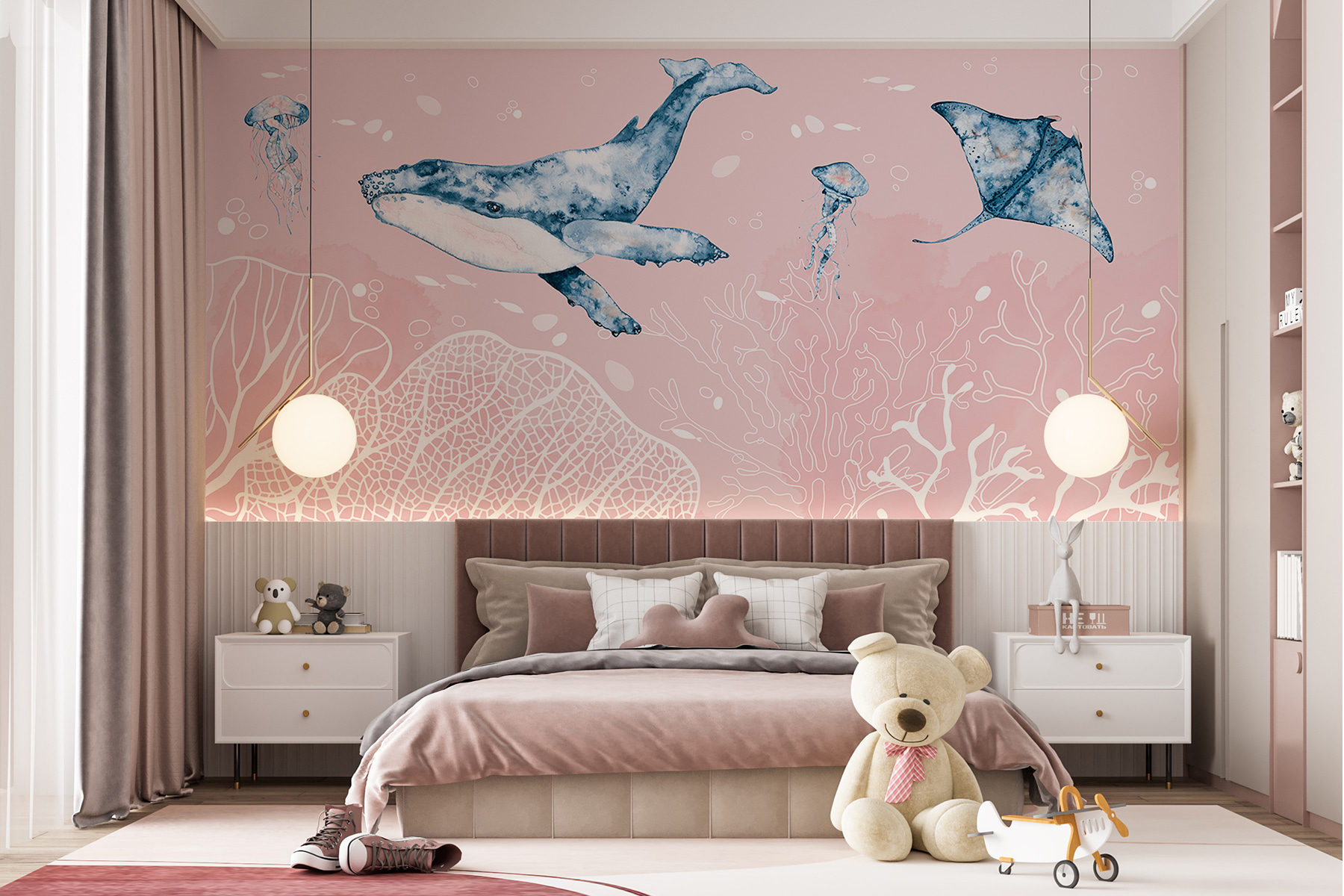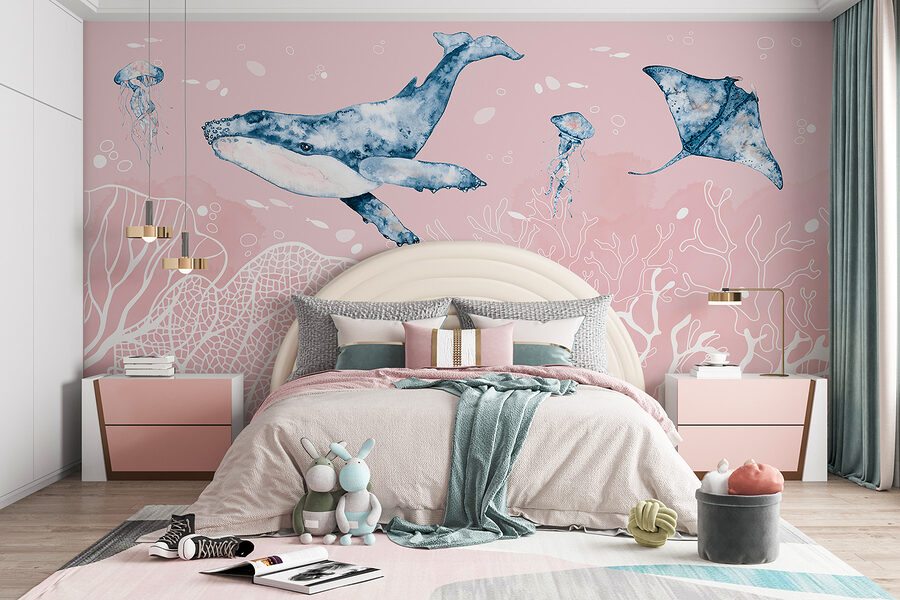 Predstavte si, že vstúpite do miestnosti a ocitnete sa v pokojnom podmorskom svete. Naša nástenná maľba “Akvarel veľryby” je ako kúsok oceánu priamo na vašej stene. Zasnené pastelové odtiene sa ľahko prelínajú a prinášajú pocit pokoja a rozmarnosti. Elegantná veľryba, pôvabné medúzy a zvedavé raje sa vznášajú okolo a vy máte pocit, že ste sa ponorili do čarovného mora.