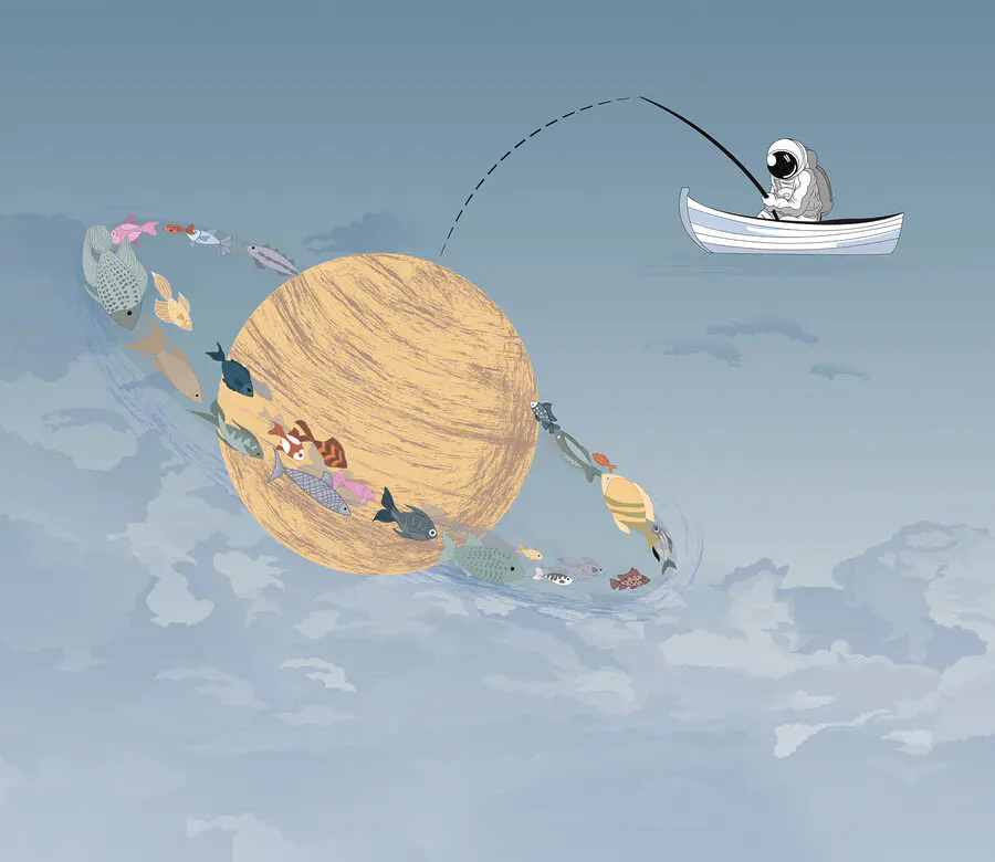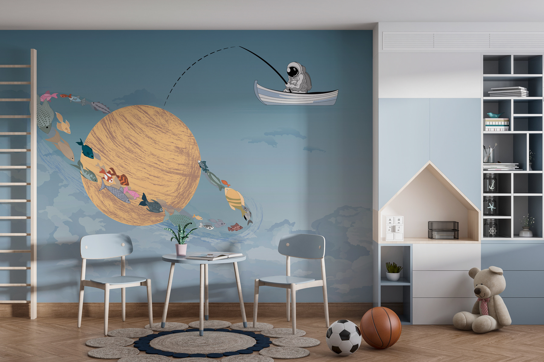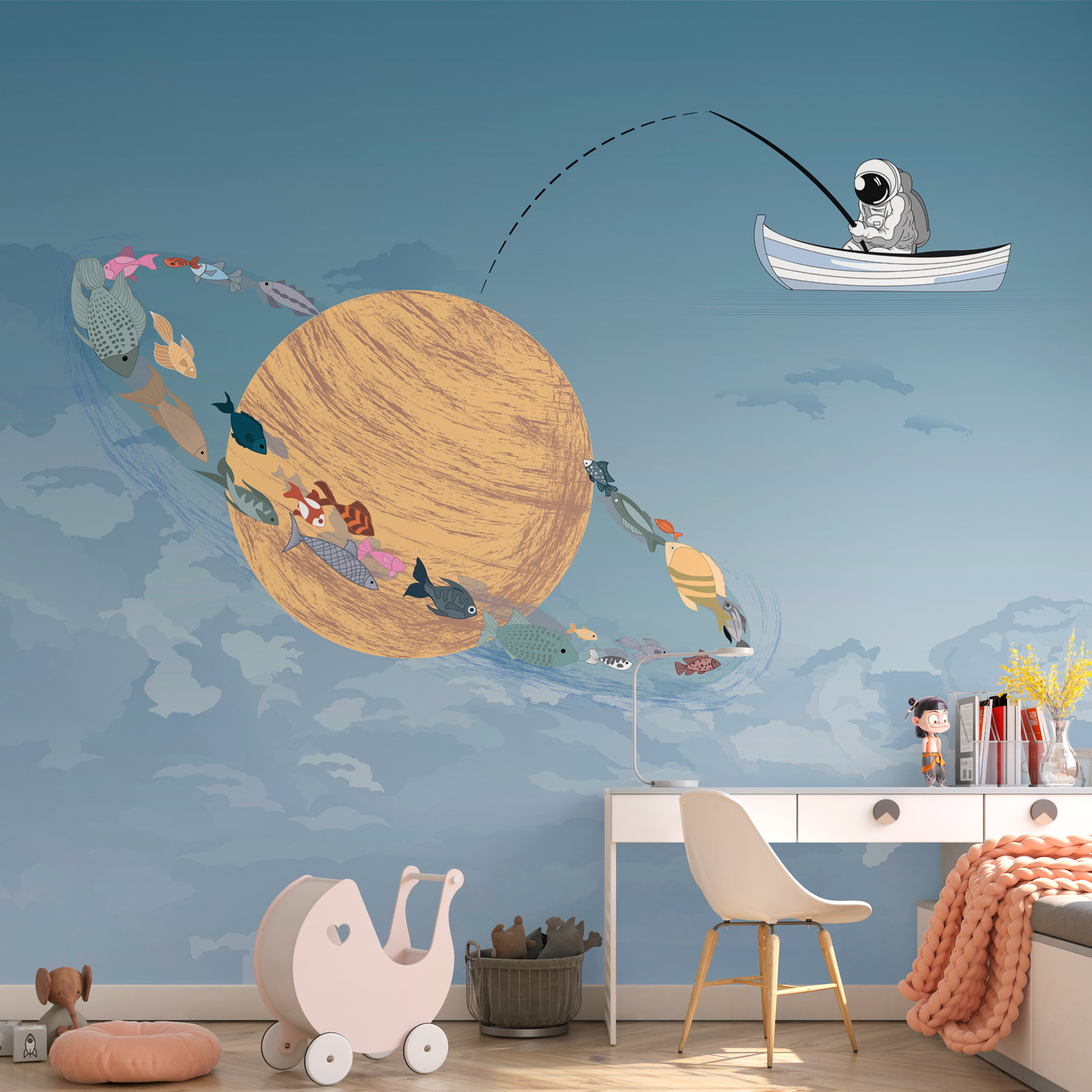 Predstavte si príjemný malý rybársky výlet, ale namiesto pokojného jazera sa vznášate v oblakoch. Táto nástenná maľba tento sen oživuje. Predstavte si rozmarnú scénu muža v člne, ktorý loví ryby na oblohe, pričom farebné ryby plávajú okolo obrovskej víriacej planéty. Jasná modrá a jemná biela vytvárajú pokojnú atmosféru, ktorá je ideálna na snívanie. Je to ako tajné dobrodružstvo, ktoré čaká priamo nad vašou hlavou. Perfektne sa hodí do detskej izby alebo kreatívneho priestoru, podnecuje predstavivosť a dodá každej stene zábavný nádych. Kto by si nechcel hodiť čiaru do oblakov?
