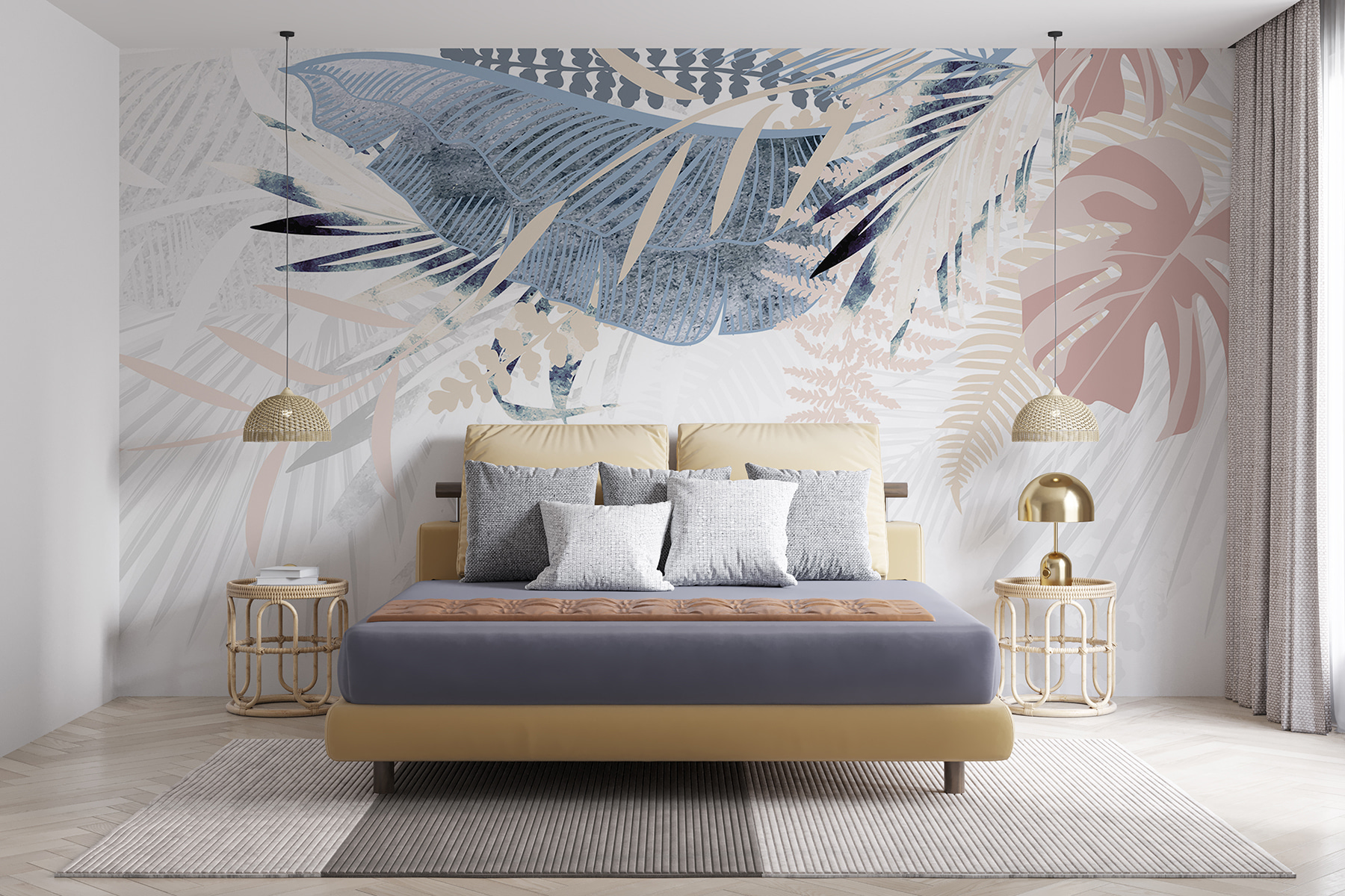 Pozrite si tento úžasný “Nástenné maľby Abstraktný dizajn tropického lístia”! Je to ako závan čerstvého vzduchu pre každú miestnosť, ktorý okamžite premení váš priestor na svieži umelecký raj. Prekrývajúce sa palmové listy a jemné tropické rastliny, vyvedené v jemných, chladných odtieňoch, ponúkajú dokonalú kombináciu pokoja a sofistikovanosti. Predstavte si, ako popíjate rannú kávu alebo relaxujete s knihou obklopení touto pokojnou atmosférou džungle.