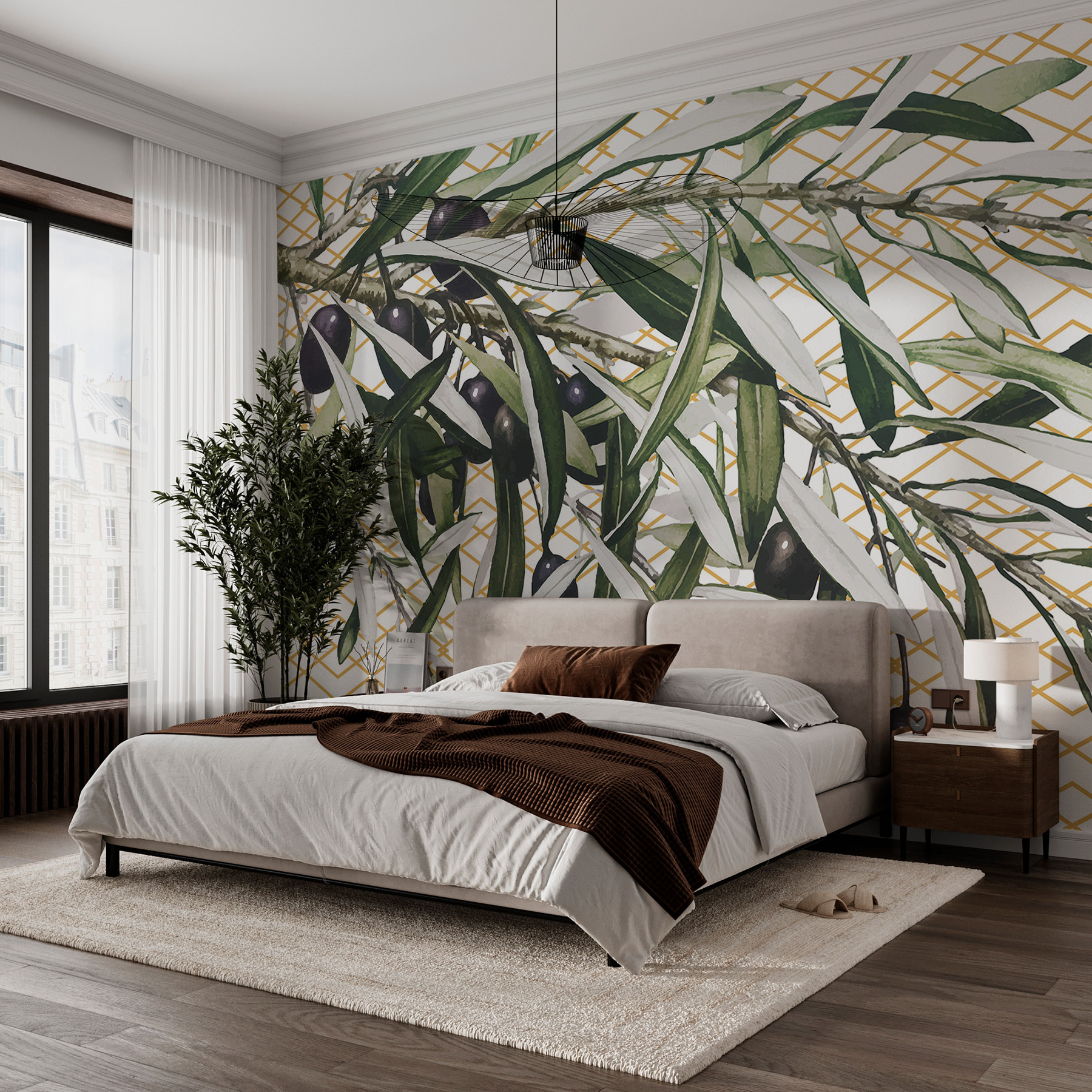 Táto nástenná maľba je nádherná! Predstavte si, že svoj priestor naplníte pokojnou atmosférou olivového hája priamo u vás doma. Na nástennej maľbe “Olivové vetvičky na geometrickom vzore” sa bez námahy spája príroda s moderným dizajnom. Geometrické pozadie je jemné, ale výrazné, čo mu dodáva moderný šmrnc. Je to ako mať to najlepšie z oboch svetov – dotyk prírody a eleganciu moderného umenia. Predstavte si, že s týmto upokojujúcim kúskom usporadúvate večeru alebo len tak relaxujete na gauči – budete sa cítiť ako na mini úteku do Stredomoria! Či už popíjate rannú kávu, alebo sa lúčite po náročnom dni, táto nástenná maľba dodá vášmu útočisku jemný, sofistikovaný šarm. Úprimne, je ťažké nezamilovať si jemné listy a elegantné olivy. Ideálna pre tých, ktorí zbožňujú dekorácie inšpirované prírodou s prímesou dizajnérskeho šiku.