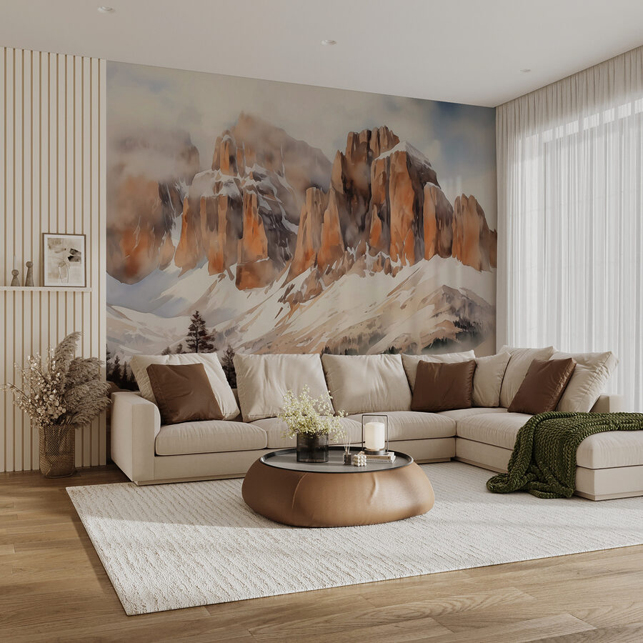 Premeňte akúkoľvek miestnosť pomocou tejto úžasnej nástennej maľby pohoria zahaleného do jemných oblakov a posiateho pružnými stromami. Len si to predstavte – každé ráno sa zobudíte a privítajú vás tieto majestátne vrcholy; je to ako mini dovolenka priamo u vás doma. Zemité farby prinášajú útulnú atmosféru, vďaka ktorej sa priestory cítia hrejivo a príjemne. Či už ide o obývaciu izbu alebo pokojné útočisko v spálni, táto nástenná maľba šepká príbehy o dobrodružstve a pokoji. Navyše je to skvelý podnet na rozhovor, keď k vám prídu priatelia. Kto by sa nechcel rozprávať o objavovaní týchto veľkolepých výhľadov?