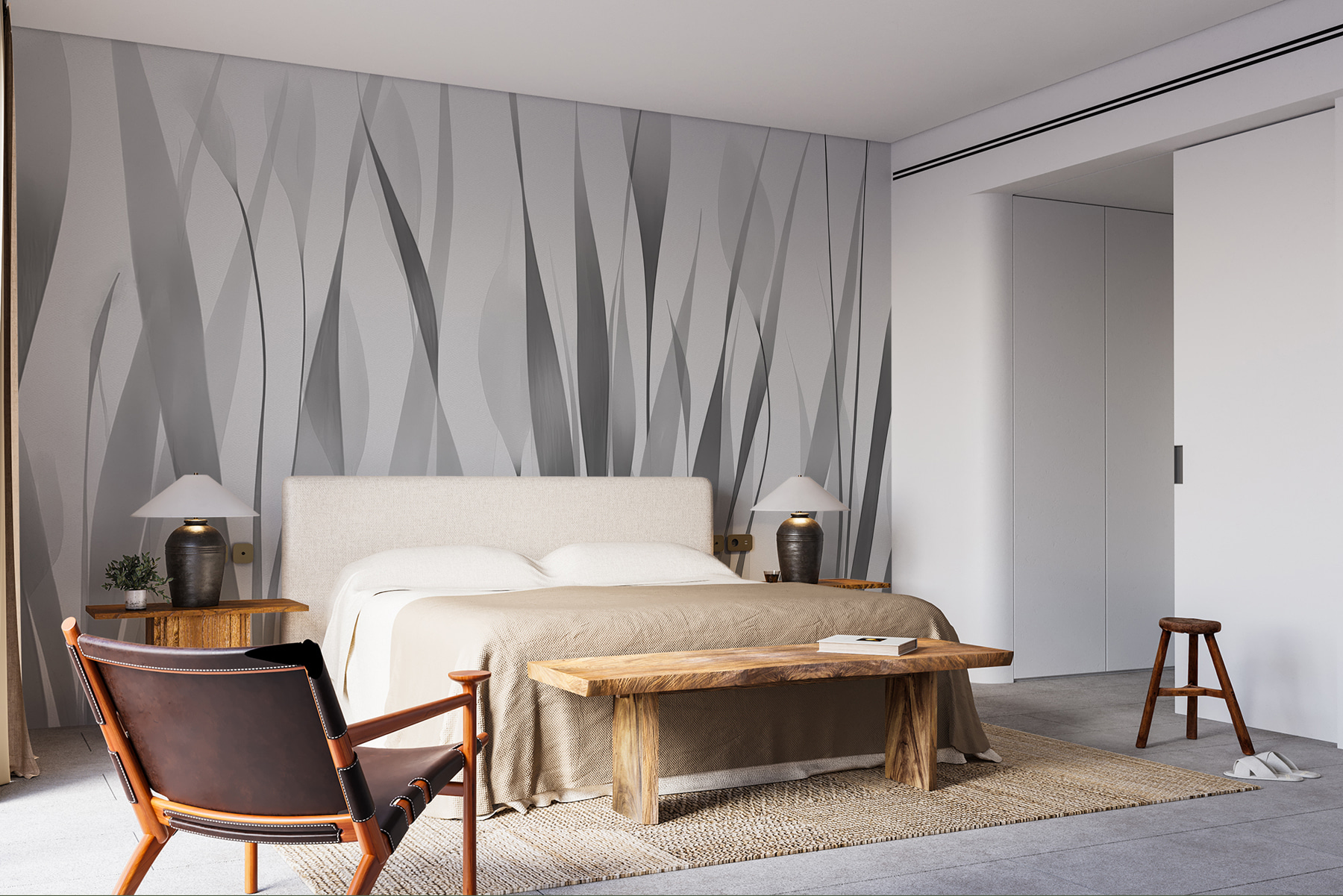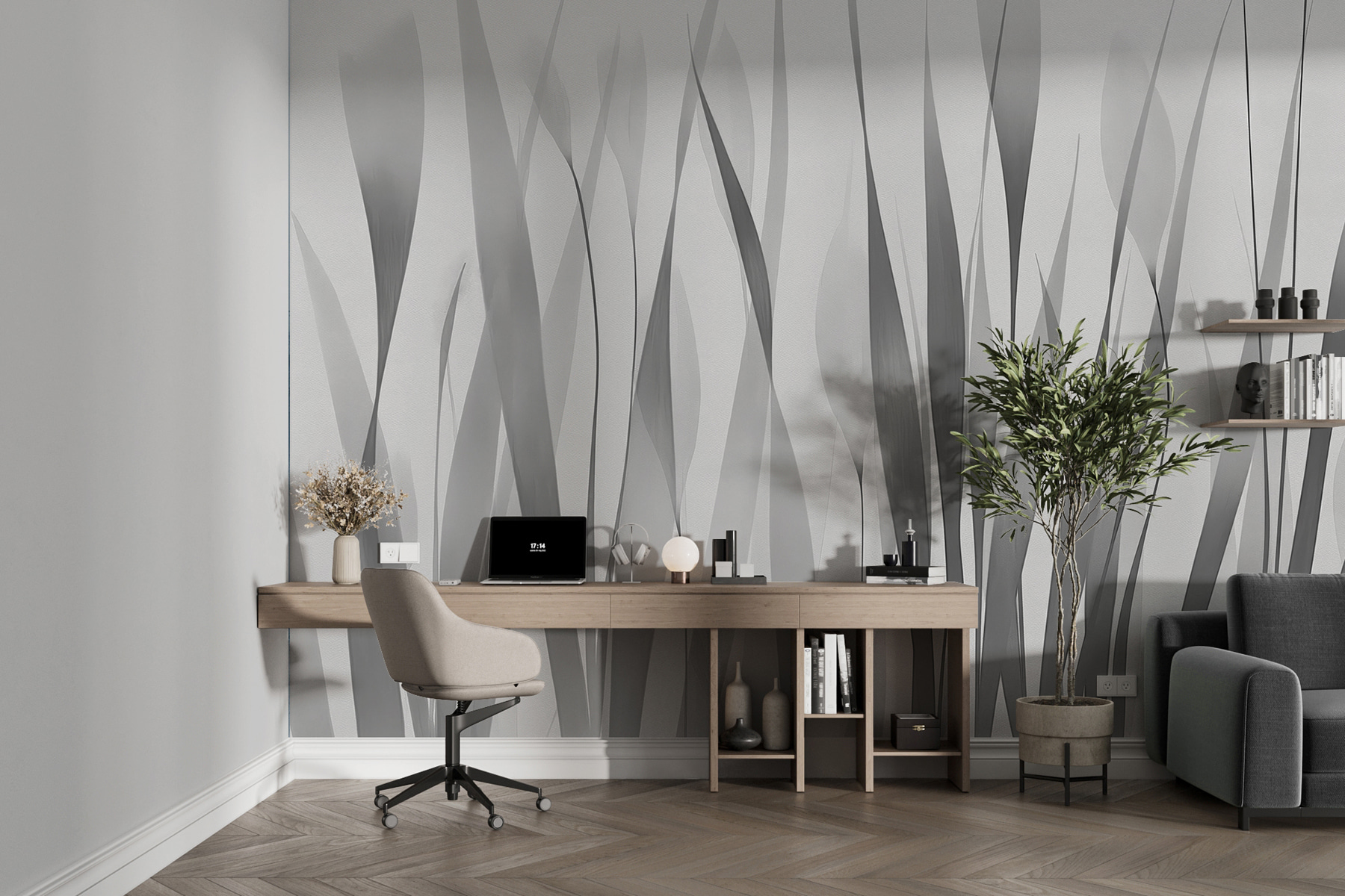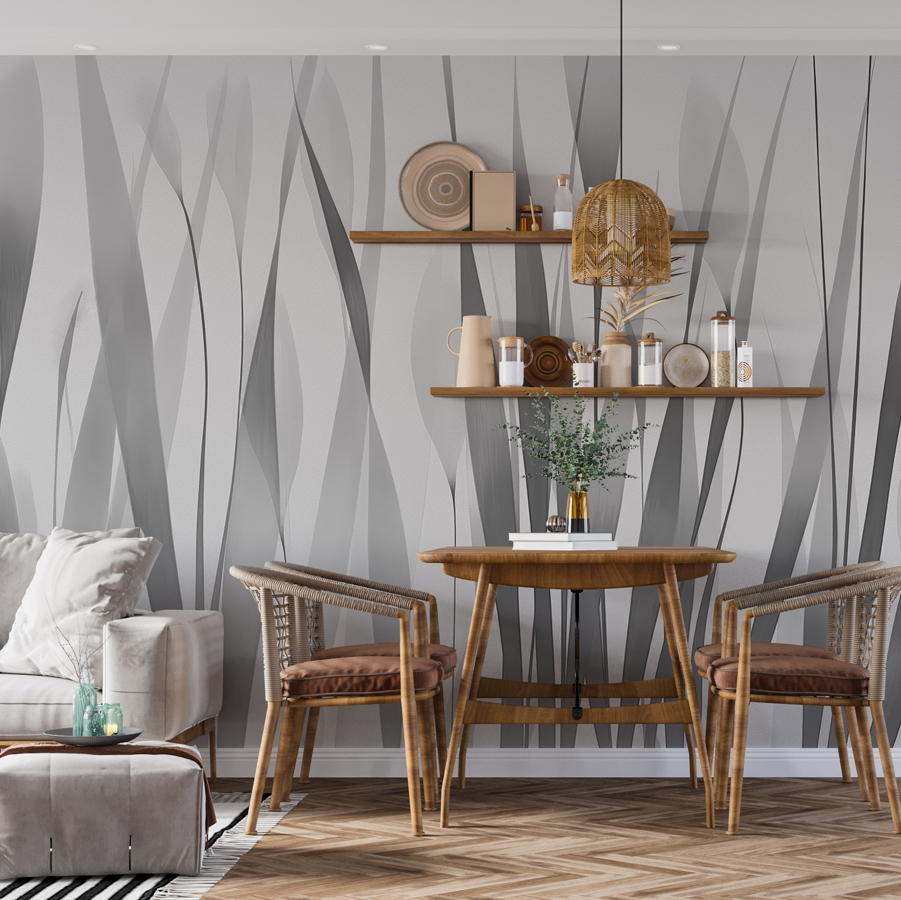 Premeňte akúkoľvek miestnosť pomocou tejto úžasnej sivobielej nástennej maľby so zasneným radom siluet rastlín. Je to ako priniesť závan čerstvého vzduchu priamo do vášho priestoru. Predstavte si, že relaxujete v útulnom kútiku obklopení týmito jemnými, elegantnými formami, ktoré sa kolíšu so svetlom – vážne upokojujúce vibrácie. Či už ide o elegantný obývací priestor alebo pokojnú spálňu, táto nástenná maľba dodáva nádych moderného umenia a zároveň udržiava pohodu. Navyše je to skvelý podnet na konverzáciu. Priatelia sa určite budú pýtať, odkiaľ je. Kto by povedal, že dekor môže pôsobiť tak ľahko sofistikovane?