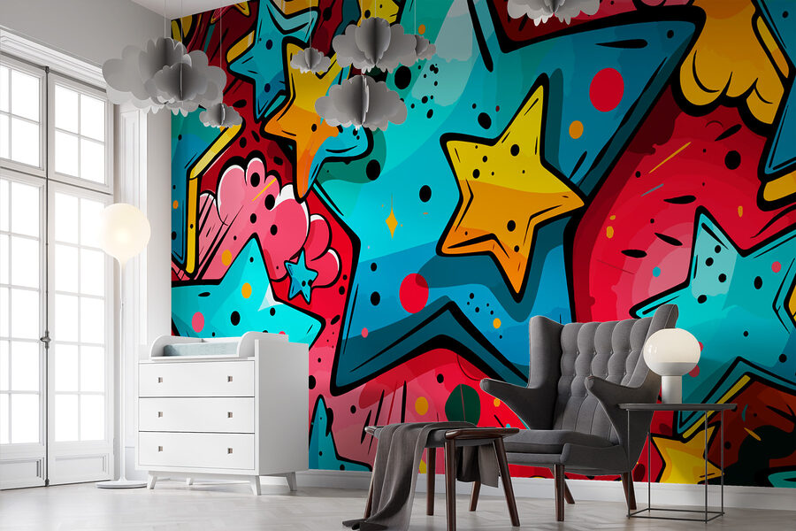 Predstavte si, že vstúpite do miestnosti a okamžite sa prenesiete do galaxie plnej rozmarov a zázrakov. Presne to dokáže nástenná maľba “Farebný hviezdny vzor”. Je to ako večierok na vašej stene, ktorý sa nikdy nekončí! Prekypuje žiarivými hviezdami a hravými farebnými odtieňmi a je ideálna pre každého, kto chce vo svojom priestore zažiť zábavu. Predstavte si dieťa, ktoré vstúpi a nadchne sa od radosti, alebo dospelého, ktorý je zrazu opäť snílkom. Je to umenie, ktoré núti ľudí hovoriť a snívať – každý sa určite bude pýtať na túto oslnivú stenu!
