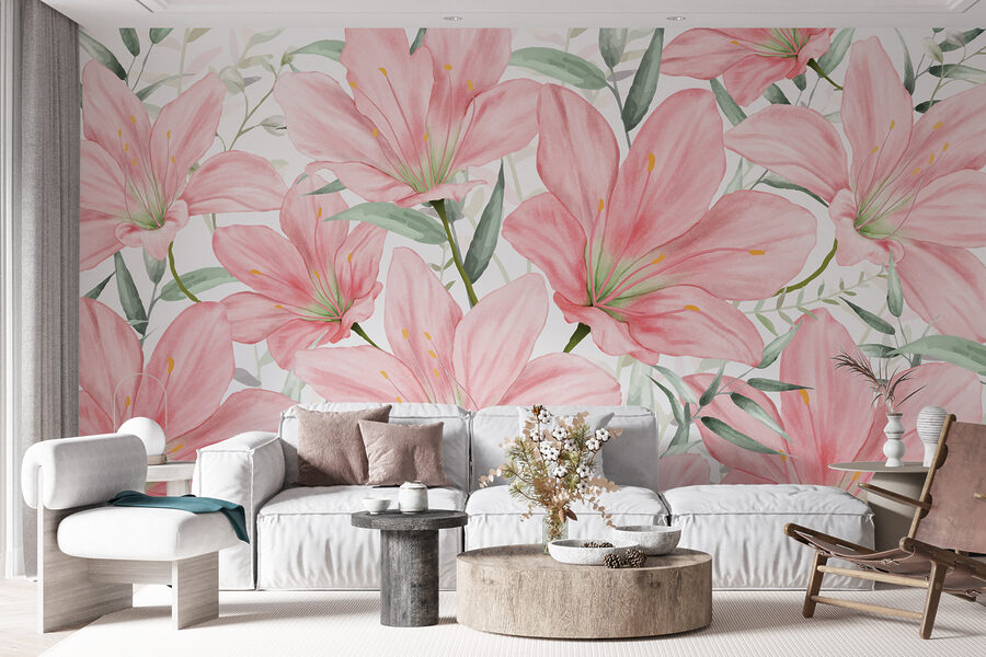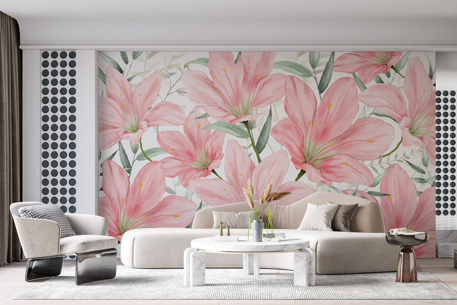 Predstavte si, že vstúpite do miestnosti, kde každá stena šepká nežný pozdrav s rozkvitnutými ľaliami, jemne ružovými a elegantne vyrovnanými. Táto nástenná maľba – nazvime ju krádežou scén – vnáša do interiéru kúsok prírody s nádychom rozprávky. Je to ako záhradná párty bez obáv o počasie! Je ideálna pre tých, ktorí milujú spojenie umenia a prírody, pôsobí ako osobné objatie od samotnej matky prírody. Hostia sa vás možno dokonca opýtajú, odkiaľ máte to úžasné “umelecké dielo” – a vy sa môžete len usmiať, vedome prikývnuť a nechať ľalie hovoriť.