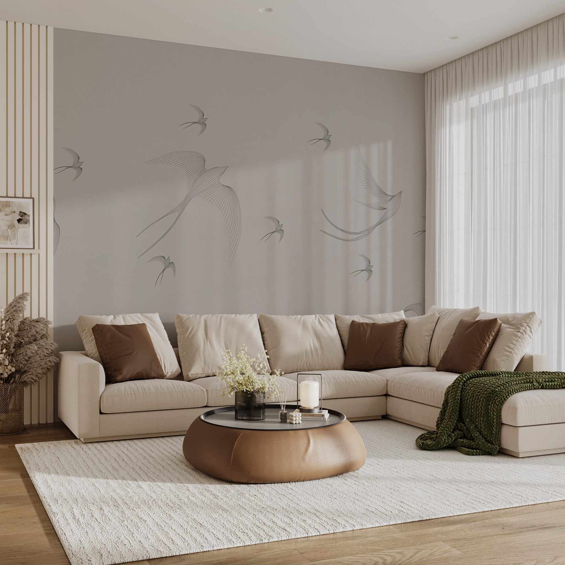 Premeňte nudnú stenu na úchvatnú oblohu pomocou nástennej maľby “Skupina letiacich vtákov”. Táto nástenná maľba zachytáva ladný tanec vtákov vznášajúcich sa vo vzduchu a prináša do každej miestnosti ľahkú, vzdušnú atmosféru. Predstavte si, ako ráno popíjate kávu a pozeráte sa na tieto elegantné tvory, ktoré akoby prelietavali okolo. Jemné farby navodzujú pokoj a pohodu – ideálne pre útulný čitateľský kútik alebo povznášajúci kancelársky priestor. Je to ako mať v interiéri kúsok prírody, ktorý každému pripomenie, že aj v tom najrušnejšom živote je vždy priestor pre slobodu a let. Nechajte svoje steny vzlietnuť!