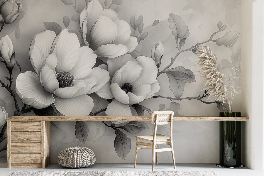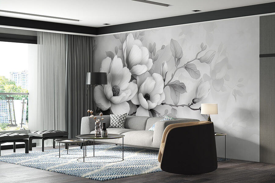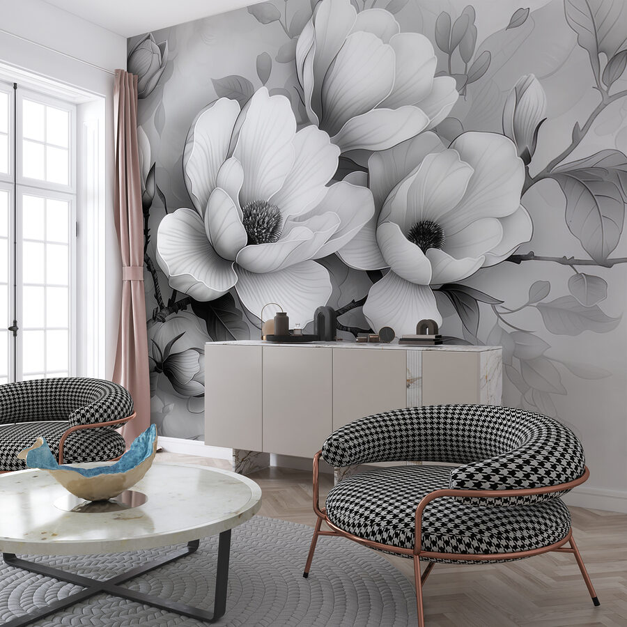 Premeňte akýkoľvek priestor pomocou tejto úžasnej nástennej maľby “Monochromatický kvet v pokojnej elegancii”. Predstavte si pokojné ráno, prúdiace svetlo a tieto jemné kvety jemne zdobiace vašu stenu. Odvážny a zároveň jemný dizajn bez námahy vyvažuje sofistikovanosť s krásou prírody. Je to ako pozvať do svojho domova pokojnú záhradu, ktorá je ideálna na snívanie alebo príjemné rozhovory. Či už ide o elegantnú obývaciu izbu alebo tichý kútik v spálni, táto fototapeta šepká eleganciu bez kriku. Je to očarujúci dotyk, ktorý núti človeka zastaviť sa, nadýchnuť sa a oceniť umenie jednoduchosti. Len si predstavte, že popíjate kávu neďaleko a cítite, ako vás oblieva pokojná atmosféra.