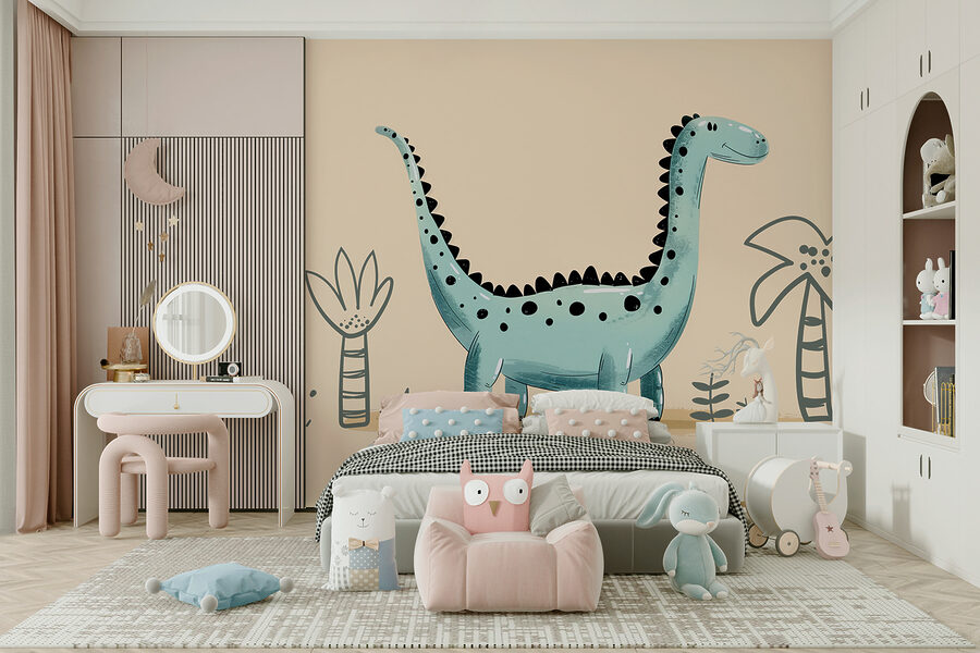 Predstavte si, že sa každé ráno budíte s týmto veselým stvorením… je to ako začať deň veselým objatím! A tie drobné rastlinky a palmy? Tie len dotvárajú atmosféru prehistorickej džungle – roztomilé, však? Je to ten typ nástennej maľby, ktorý dokáže premeniť nudnú stenu na rozkošnú scénu z rozprávkovej knihy.