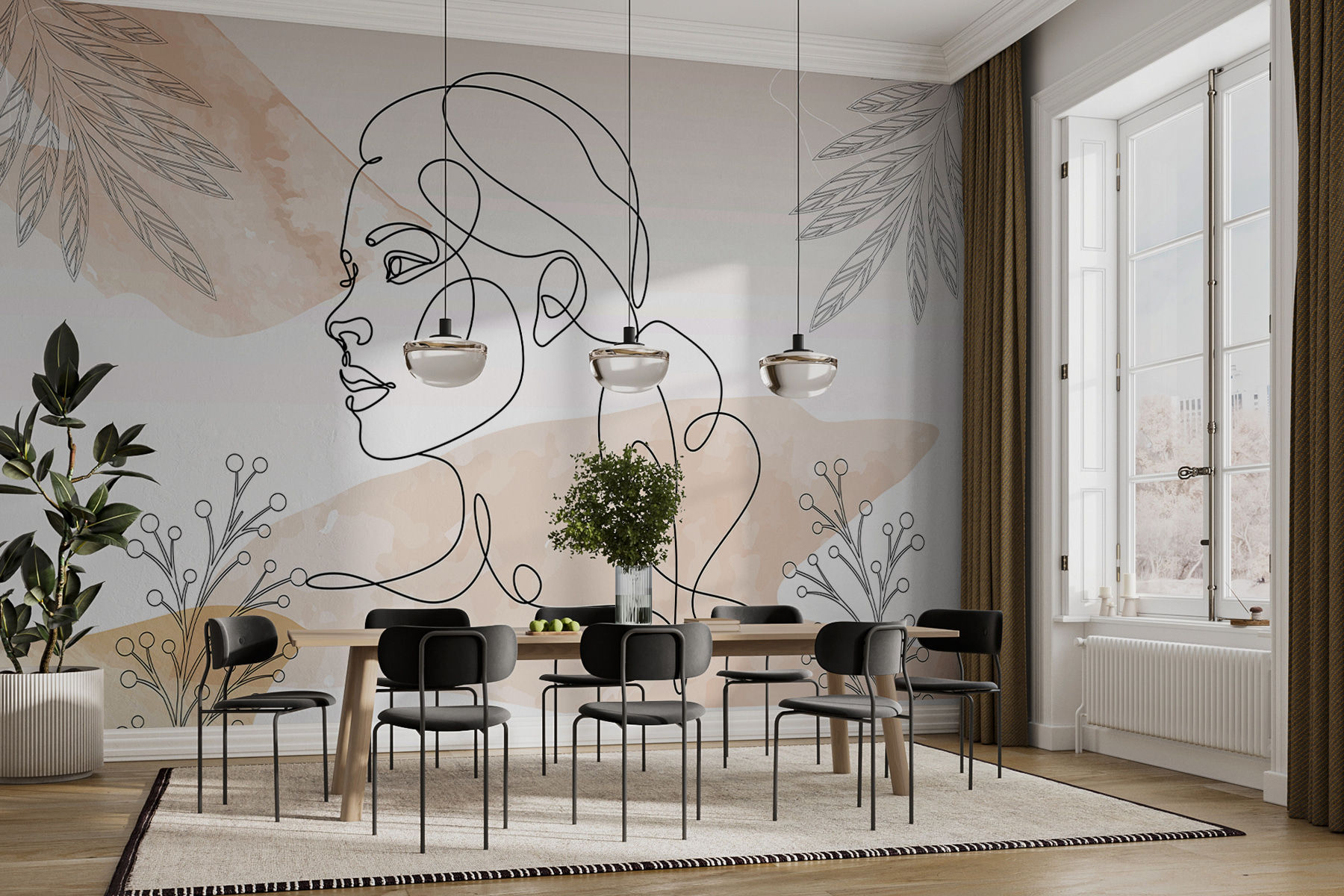 Predstavte si, že vojdete do miestnosti a privíta vás očarujúca prítomnosť ženskej tváre, umne stvárnenej na úžasnej nástennej maľbe. Tento kúsok, v ktorom sa spájajú jednoduché línie s jemnými, zemitými farbami, dodá každému priestoru štipku osobnosti. Šepká príbehy, pozýva ku konverzácii a snívaniu. Predstavte si priateľov, ako sa stretávajú, oči upierajú na nástennú maľbu a každý interpretuje krásu vlastnou optikou. Nie je to len dekor, je to atmosféra, ktorá vzbudzuje inšpiráciu a teplo. Táto nástenná maľba, ideálna do útulného zákutia alebo živého obytného priestoru, bez námahy premieňa steny na plátna emócií a vyjadrenia.