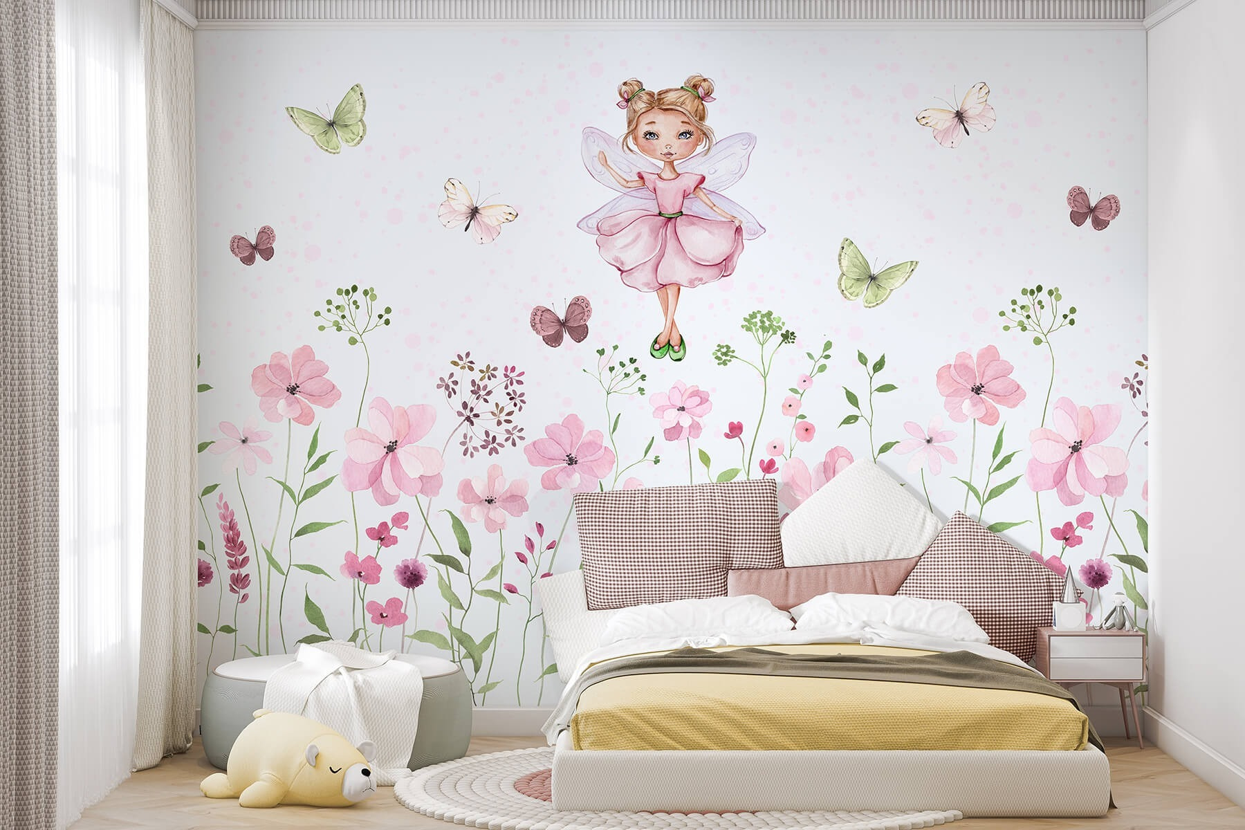 Premeňte akýkoľvek priestor na rozmarné útočisko pomocou tejto očarujúcej nástennej maľby “Akvarel víly v ružových šatách obklopenej kvetmi”. Predstavte si rozkošnú vílu, zachytenú uprostred tanca, obklopenú poľom jemných pastelových farieb. Je to ako vstúpiť do rozprávkovej knihy, v ktorej sa jemne preháňajú motýle. Predstavte si, že sa každý deň prebúdzate s touto radostnou scénou – nepozdvihne to náladu? Je ideálny do detskej izby alebo do útulného zákutia, dodáva kúzlo a povedzme si úprimne, komu by sa v živote nehodilo trochu viac kúzla? Táto nástenná maľba je ideálna na snenie alebo inšpiráciu k tvorivosti, jej čaru sa jednoducho nedá odolať. Tak si vezmite šálku čaju, pohodlne sa usaďte a nechajte okolo seba rozprávať rozprávky!