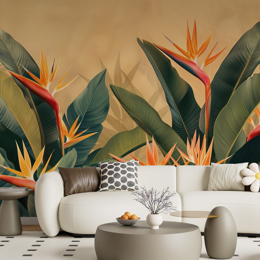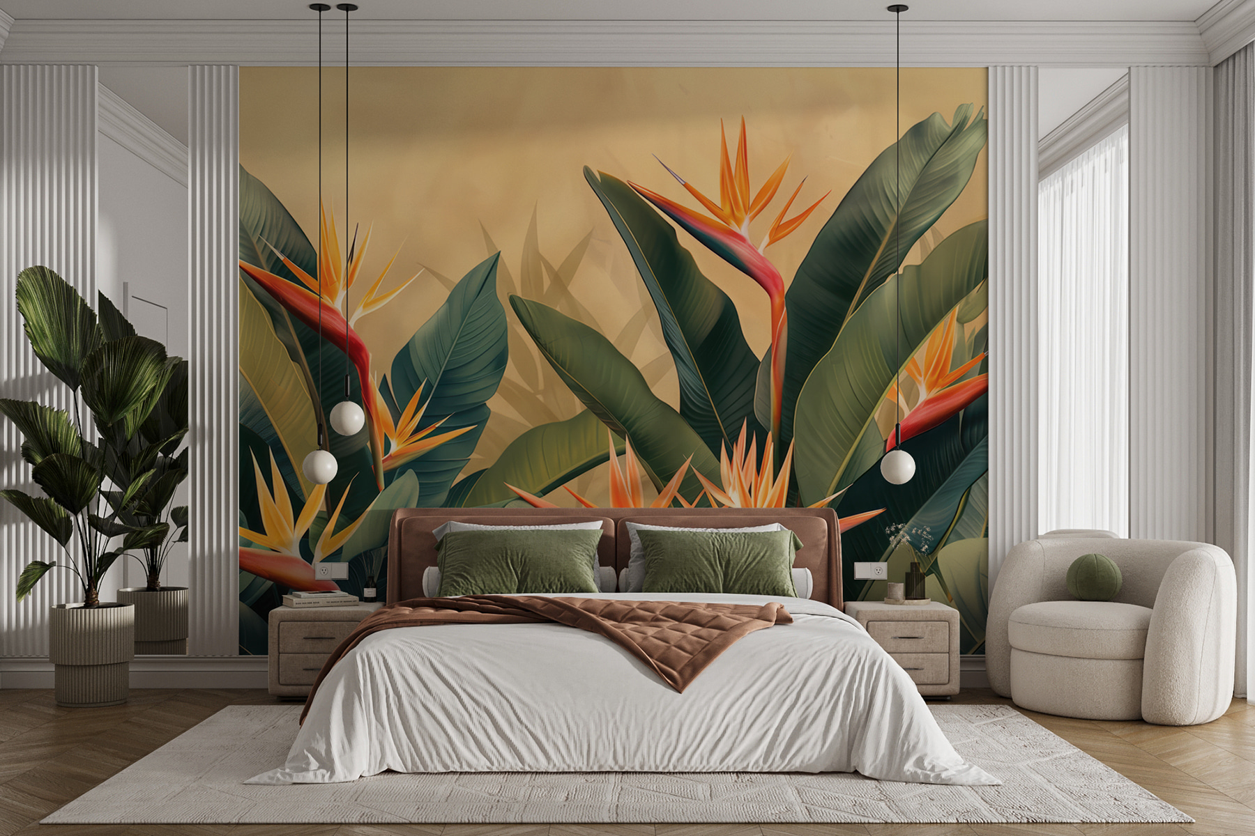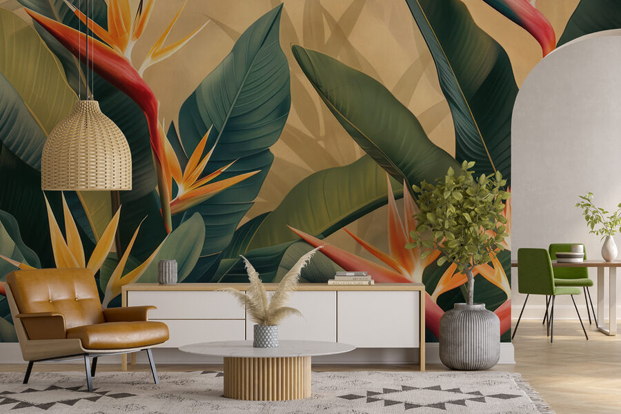 Premeňte akúkoľvek miestnosť na tropický raj pomocou tejto úžasnej nástennej maľby so živými rajskými vtákmi. Sýta zelená a ohnivá oranžová vytvárajú živé pozadie a okamžite pozdvihnú náladu. Predstavte si, že vstúpite do svojej obývačky a budete sa cítiť ako na slnkom zaliatej tropickej dovolenke. Je to ako preniesť kúsok prírody do interiéru – ideálne na príjemné popoludnia s knihou alebo možno s drzým kokteilom v ruke. Navyše je to skvelý začiatok konverzácie. Hostia sa budú pýtať, odkiaľ sa vzala tá úžasná nástenná maľba, a vy môžete s úsmevom povedať, že je to tajomstvo vášho elegantného úteku!