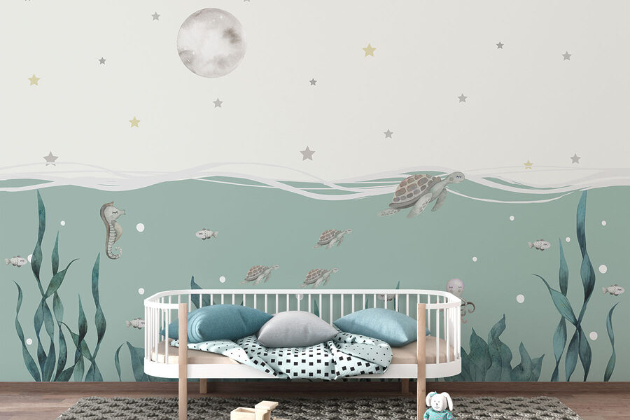 Predstavte si, že sa pri každom vstupe do miestnosti ponoríte do pokojného podmorského sveta. Táto nástenná maľba “Morské riasy & morské koníky” zachytáva jemný tanec morských tvorov pod hviezdnou nočnou oblohou. Je to, akoby sa vaše steny nádherne ponorili do oceánu. Perfektne sa hodí do každého priestoru, ktorý potrebuje nádych rozmarnosti alebo upokojujúcu atmosféru. Navyše, kto by nechcel pri popíjaní rannej kávy sledovať, ako sa okolo neho kĺžu drobné korytnačky? Smelo do toho – pridajte do svojho interiéru kúsok morskej prírody a nechajte svoju fantáziu plávať!