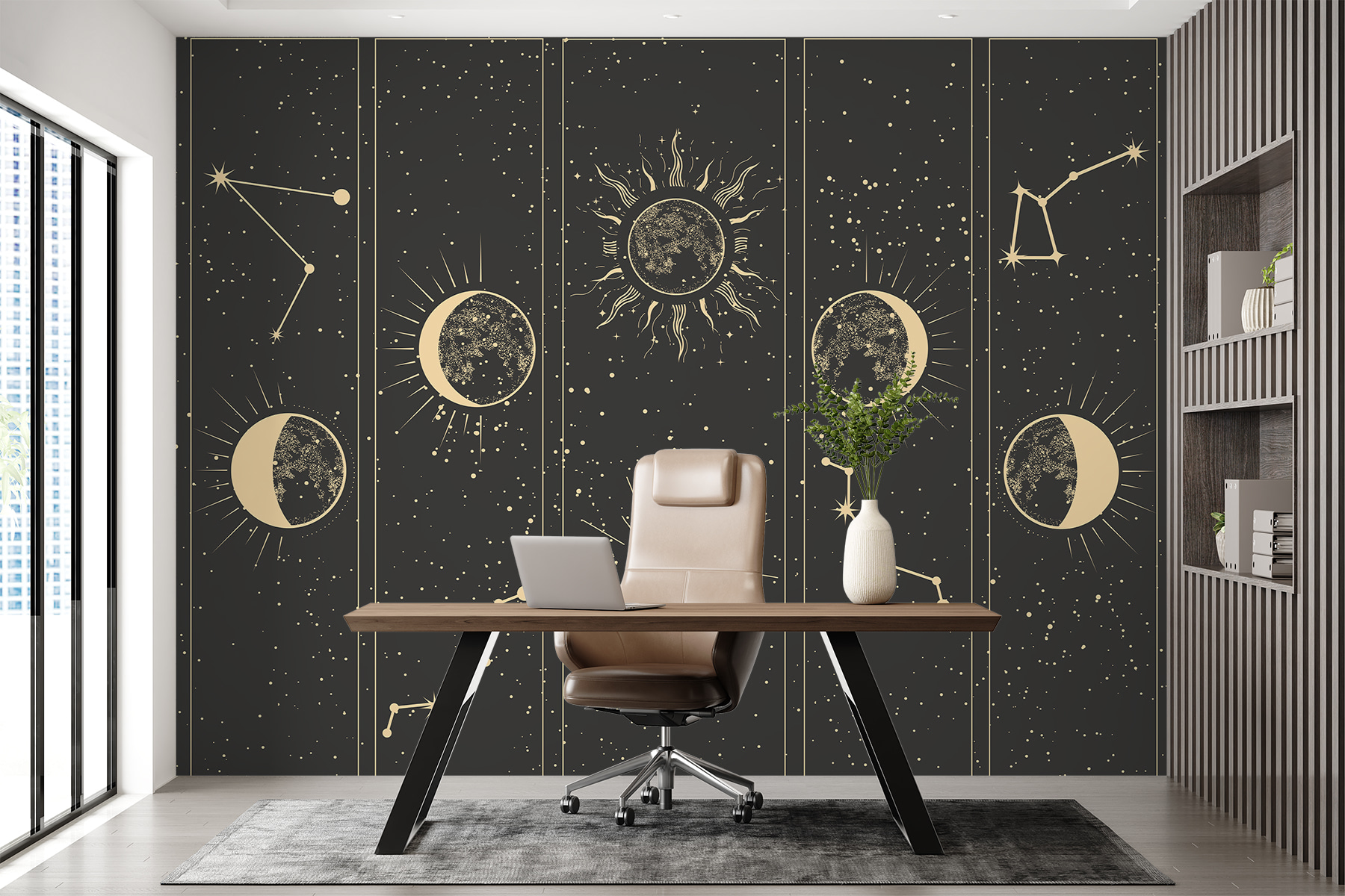 Predstavte si, že vstúpite do miestnosti, v ktorej máte pocit, akoby ste sa vznášali vo vesmíre! Táto nástenná maľba “Mesiac a hviezdy” dodá vášmu priestoru snovú atmosféru, ktorá je ideálna pre milovníkov hviezd a mesiaca. Je to ako mať kúsok nočnej oblohy priamo u vás doma – bez chladného vetra. Rozmarné súhvezdia tancujú po vašej stene a podnecujú predstavivosť. Či už ležíte na gauči a premýšľate o záhadách života, alebo len potrebujete trochu vesmírneho pokoja po hektickom dni, táto nástenná maľba je vašou vstupenkou do hviezdneho pokoja. Vychutnajte si to kúzlo!