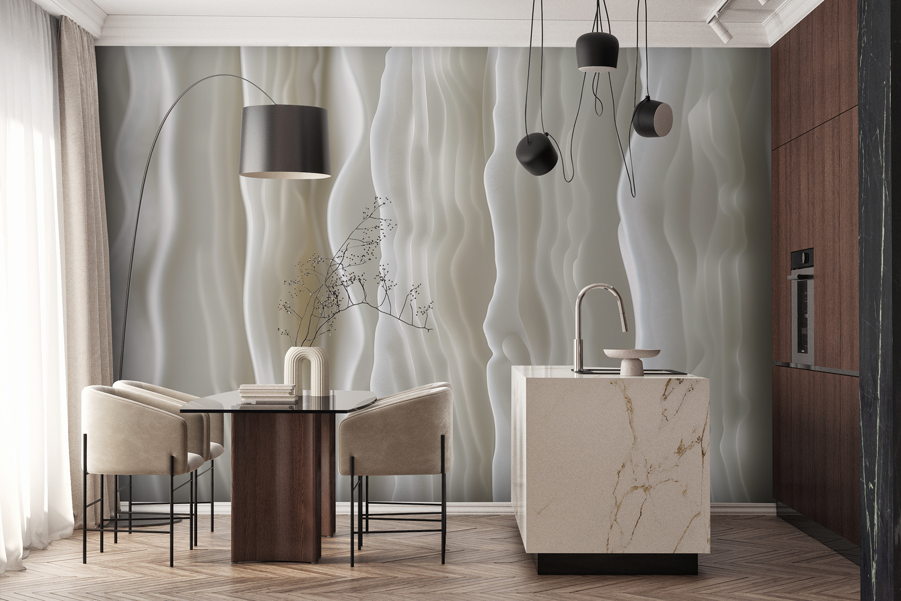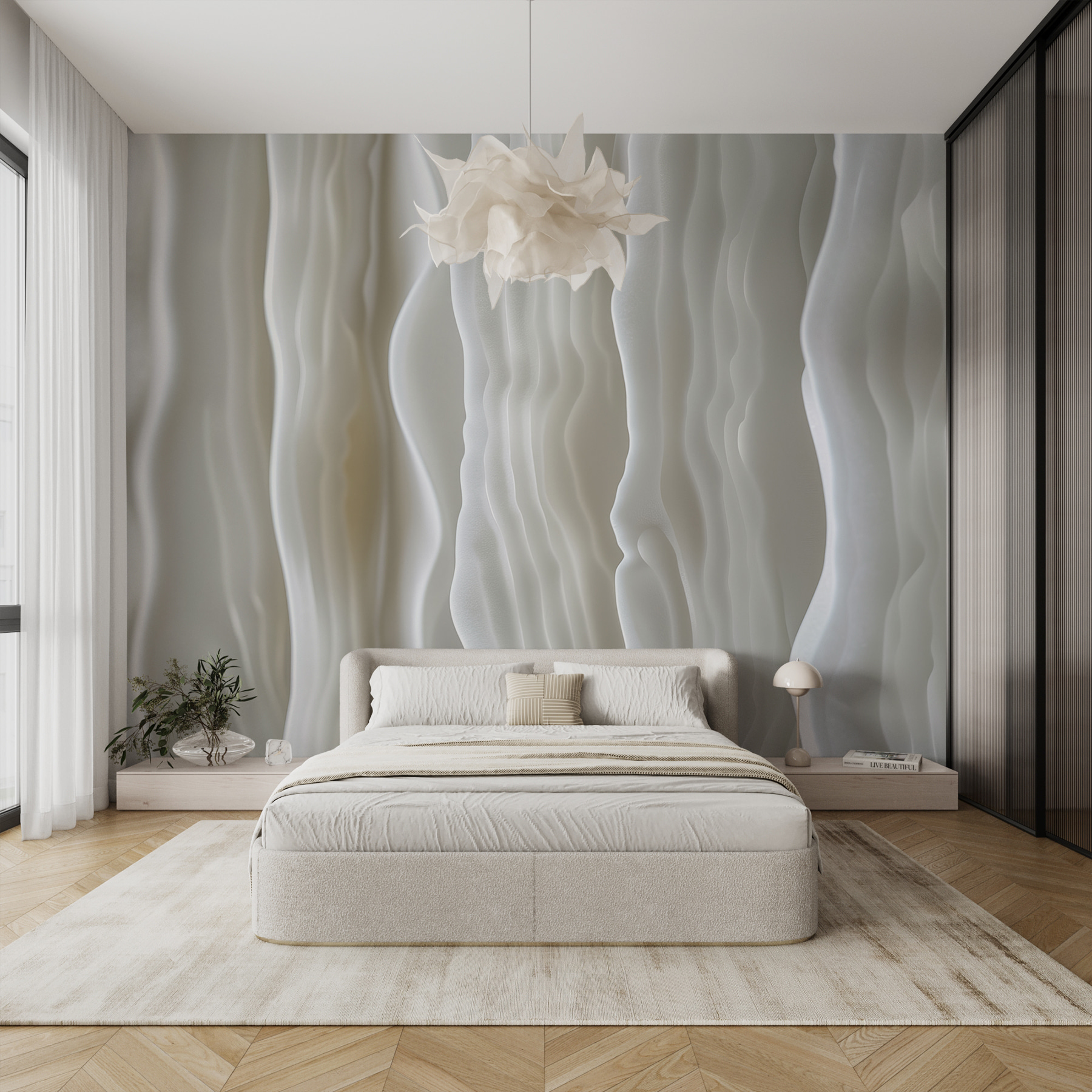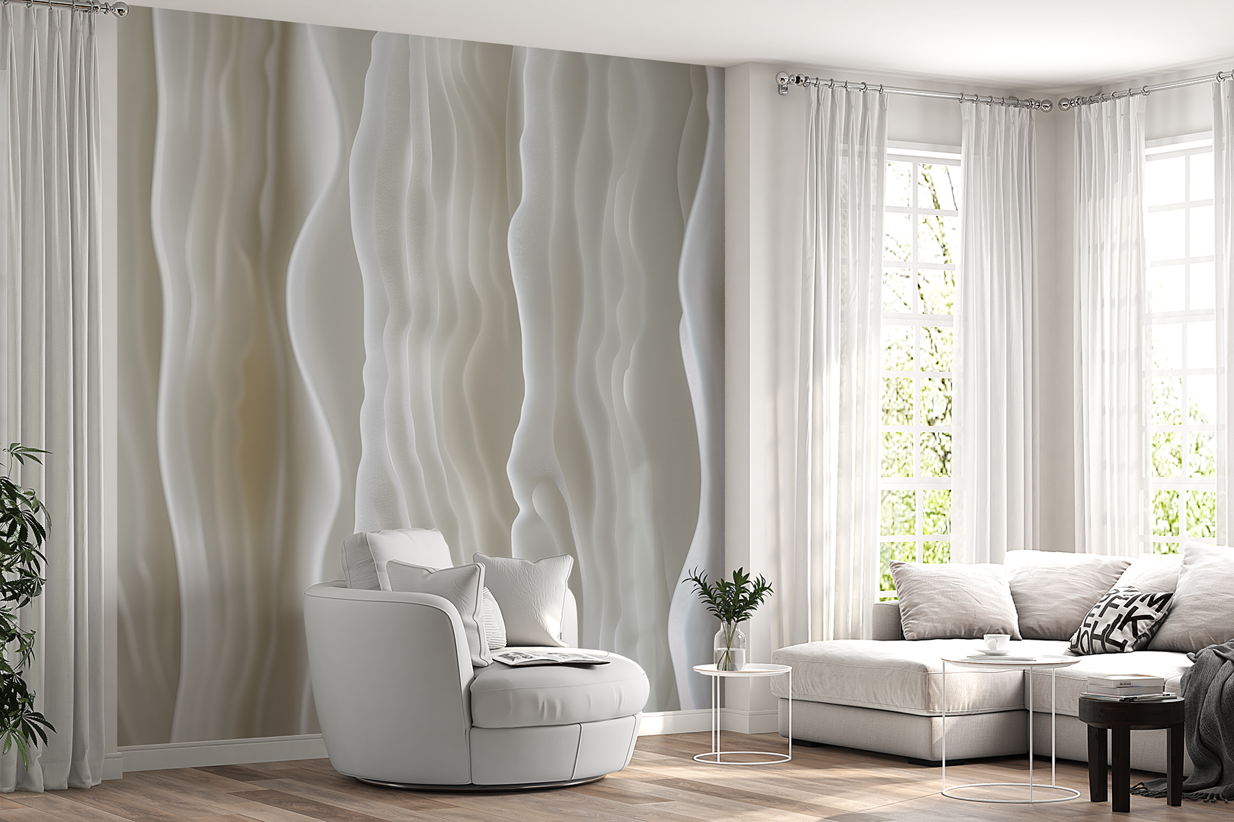 Predstavte si, že vstúpite do miestnosti, ktorej steny sa vlnia ako jemný vánok nad pokojným morom. Zoznámte sa s nástennou maľbou “Vlniaca sa biela” – úžasným tancom jemných abstraktných vĺn, ktorý premení akýkoľvek priestor na modernú oázu. Tie plynúce línie! Dodávajú hĺbku a takmer magický pokoj. Perfektne sa hodí do útulného zákutia alebo do novej luxusnej kancelárie a šepká sofistikovanosť s nádychom rozmarnosti. Je to ako mať doma minigalériu umenia. Priatelia sa možno dokonca opýtajú: “Vy ste to prerobili?” Stačí sa usmiať a nechať hovoriť vlny.