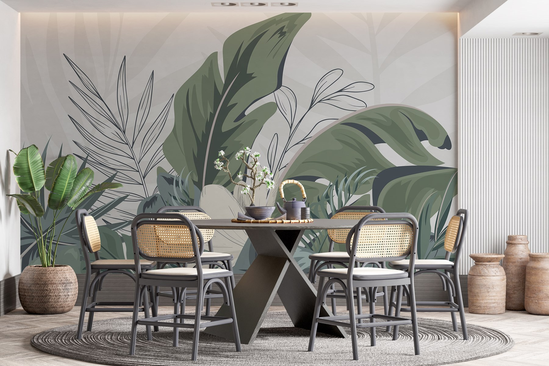 Premeňte akýkoľvek priestor na pokojné útočisko pomocou tejto úžasnej nástennej maľby “Prírodné lístie v harmónii a rovnováhe”. Predstavte si, že každé ráno vstúpite do sviežeho raja, kde vás živá zeleň a jemné textúry pozývajú k odpočinku. Táto nástenná maľba dokonale spája tropické vibrácie s upokojujúcou estetikou, takže je fantastickým pozadím pre pokojné večery alebo živé stretnutia. Predstavte si, ako popíjate kávu obklopení krásou prírody alebo hostíte priateľov v prostredí pripomínajúcom oázu. Je to ako pozvať si kúsok prírody priamo k sebe domov – bez chrobákov! Je ideálny do obývacích izieb, spální alebo aj kreatívnych priestorov a určite vyvolá radosť a trochu závisti u hostí. Rovnováha, harmónia a nádych prírody – čo viac si môže niekto priať?