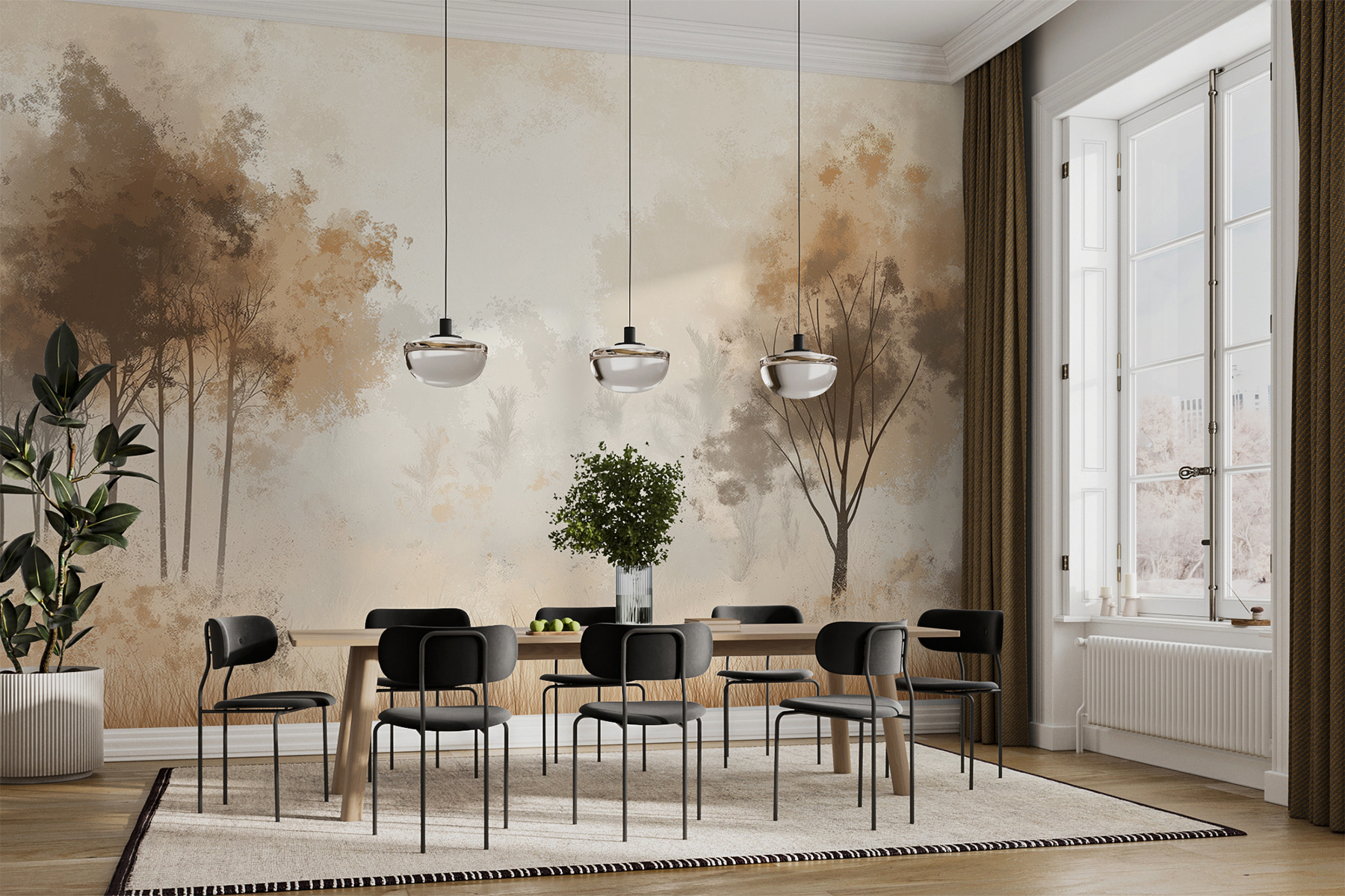Tu je niečo výnimočné: nástenná maľba zachytávajúca hmlistý les – stromy sa tiahnu hore, okolo nich sa krúti hmla, tráva sa jemne kolíše. Ideálne na premenu akejkoľvek miestnosti na šepotavé lesné útočisko. Je to ako vstúpiť priamo do rozprávky, bez hovoriacich zvierat (bohužiaľ). Ráno s kávou v ruke môžete takmer cítiť vôňu rosy. Milovníci prírody, vaša prázdna stena práve našla svoje poslanie. Predstavte si hostí, ktorí vchádzajú dnu, padá im čeľusť a pýtajú sa: “Kde je Narnia?” Je to atmosféra, nielen nástenná maľba.