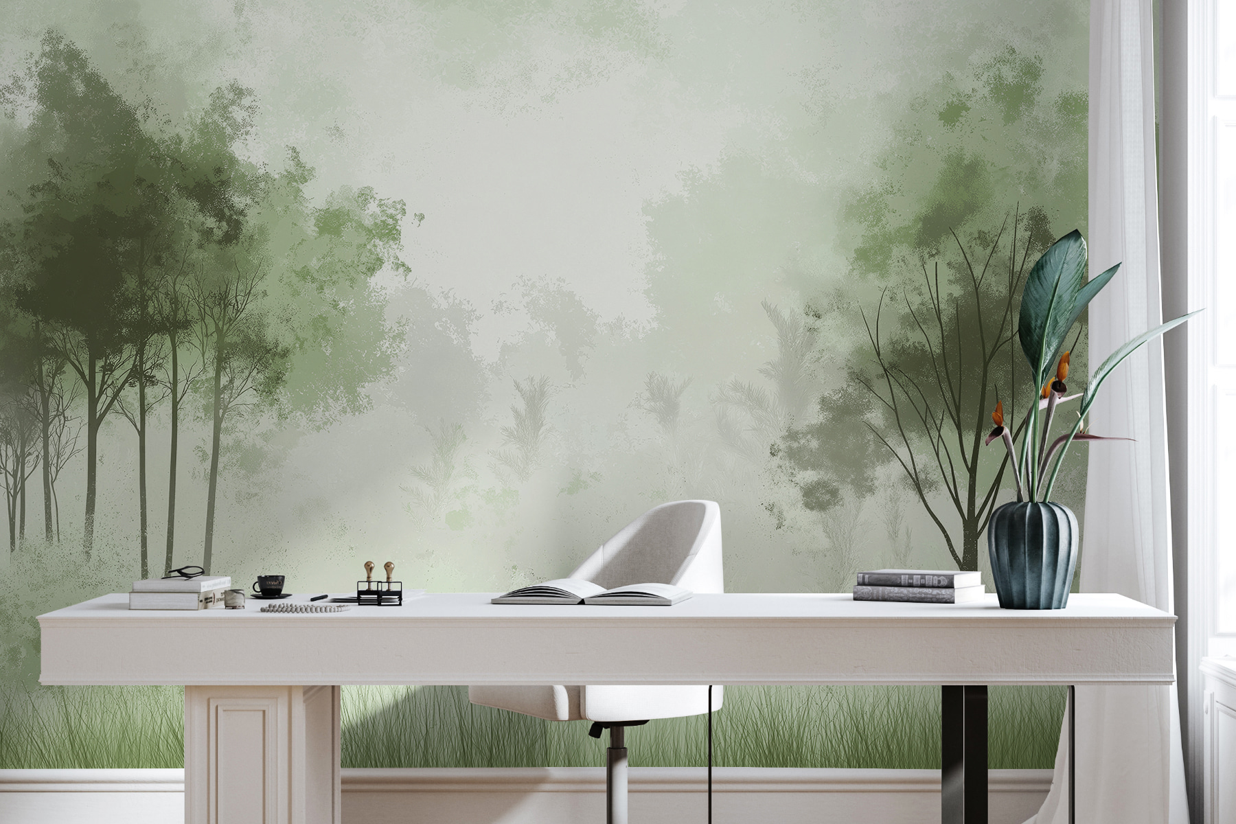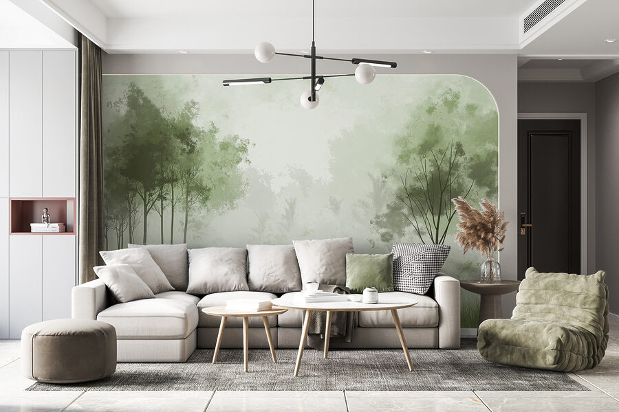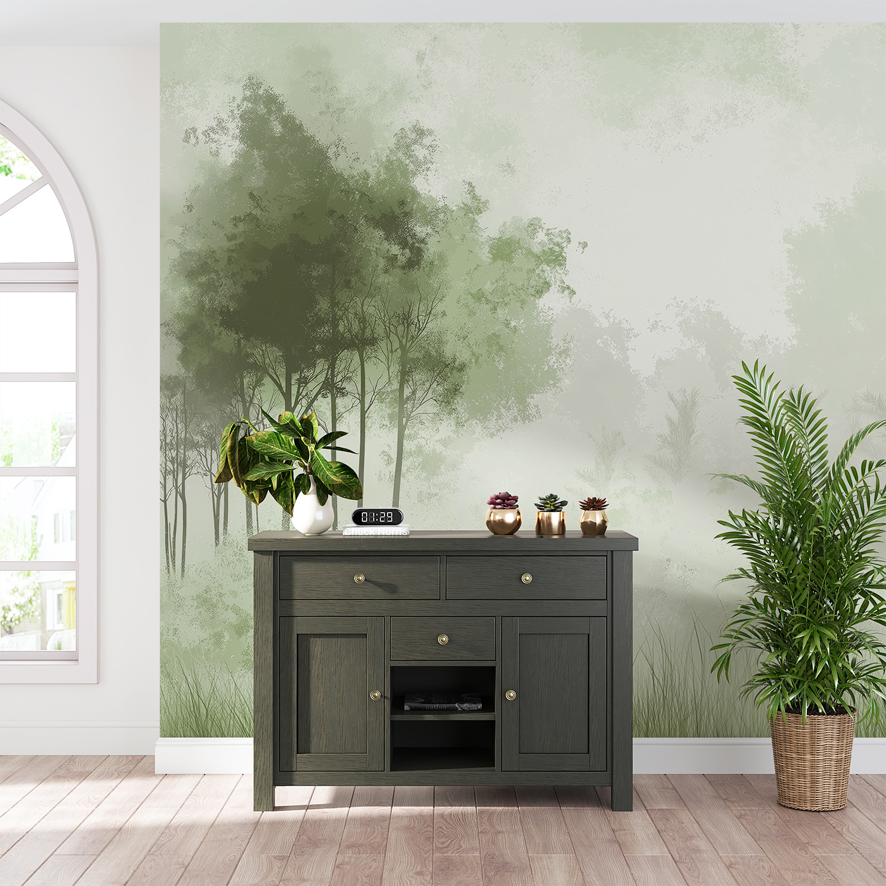 Predstavte si, že vstúpite do miestnosti a okamžite máte pocit, že ste sa zatúlali do hmlistého ranného lesa. Táto nástenná maľba “Hmlistý les so stromami” to dokáže – je ako jemné objatie od prírody priamo na vašej stene. Ideálna pre každého, kto miluje pokoj lesa, ale radšej vynechá komáre. Jemná, tlmená zelená a tajomná hmla vytvárajú upokojujúcu atmosféru, takže je ideálna na relaxáciu po hektickom dni. Je to niečo, čo môže vašu mačku prinútiť pozerať na stenu v presvedčení, že sa tam niekde skrýva veverička. Nečakané kúzlo zaručené.