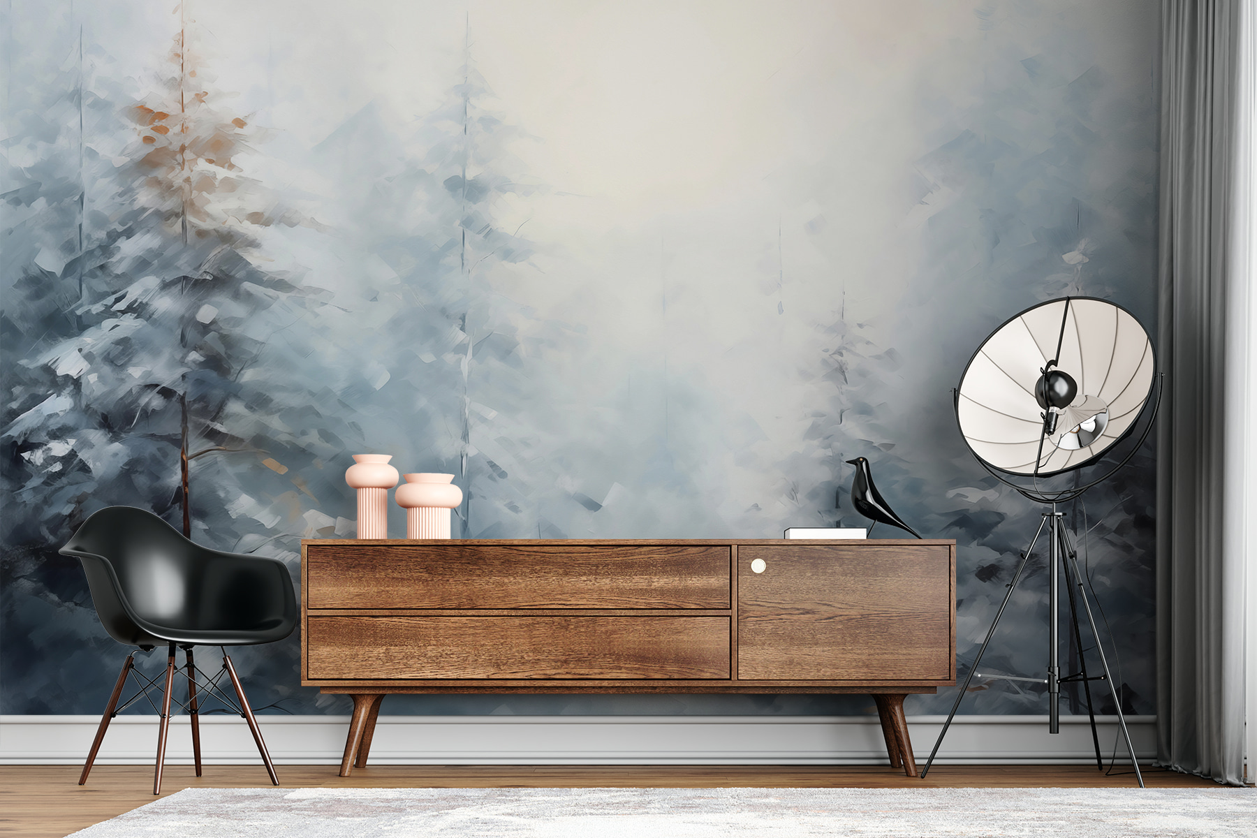 Predstavte si, že vstúpite do miestnosti a máte pocit, akoby ste boli prenesení do pokojnej zimnej krajiny. Táto nástenná maľba so snovým vyobrazením zasnežených stromov prinesie túto čarovnú lesnú atmosféru priamo do vášho domova. Predstavte si, že pri pohľade na ňu popíjate horúce kakao a vo vzduchu cítite jemný chlad – aj keď je práve stred leta. Ideálny pre milovníkov prírody a tých, ktorí jednoducho potrebujú trochu pokoja vo svojom chaotickom živote. Je to ako objatie od prírody, bez omrzlín. Príjemné, chladivé a úžasne upokojujúce!