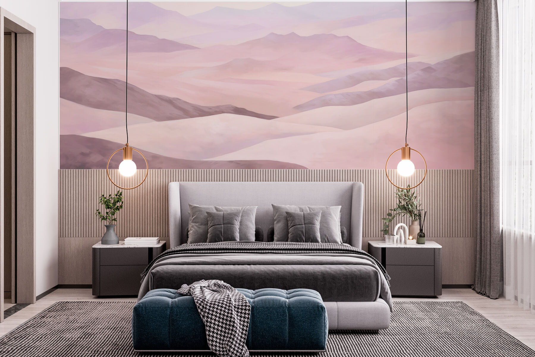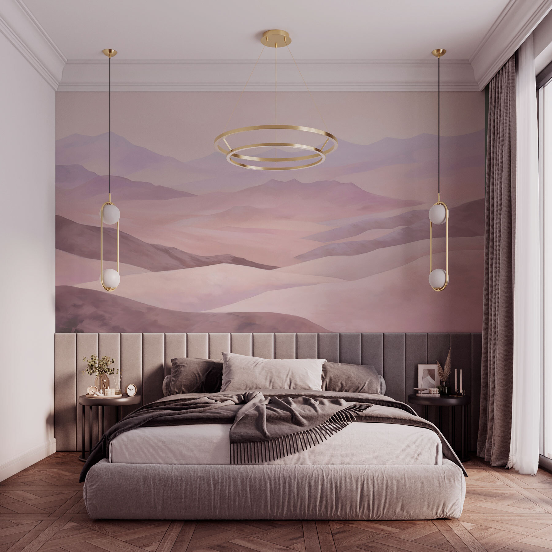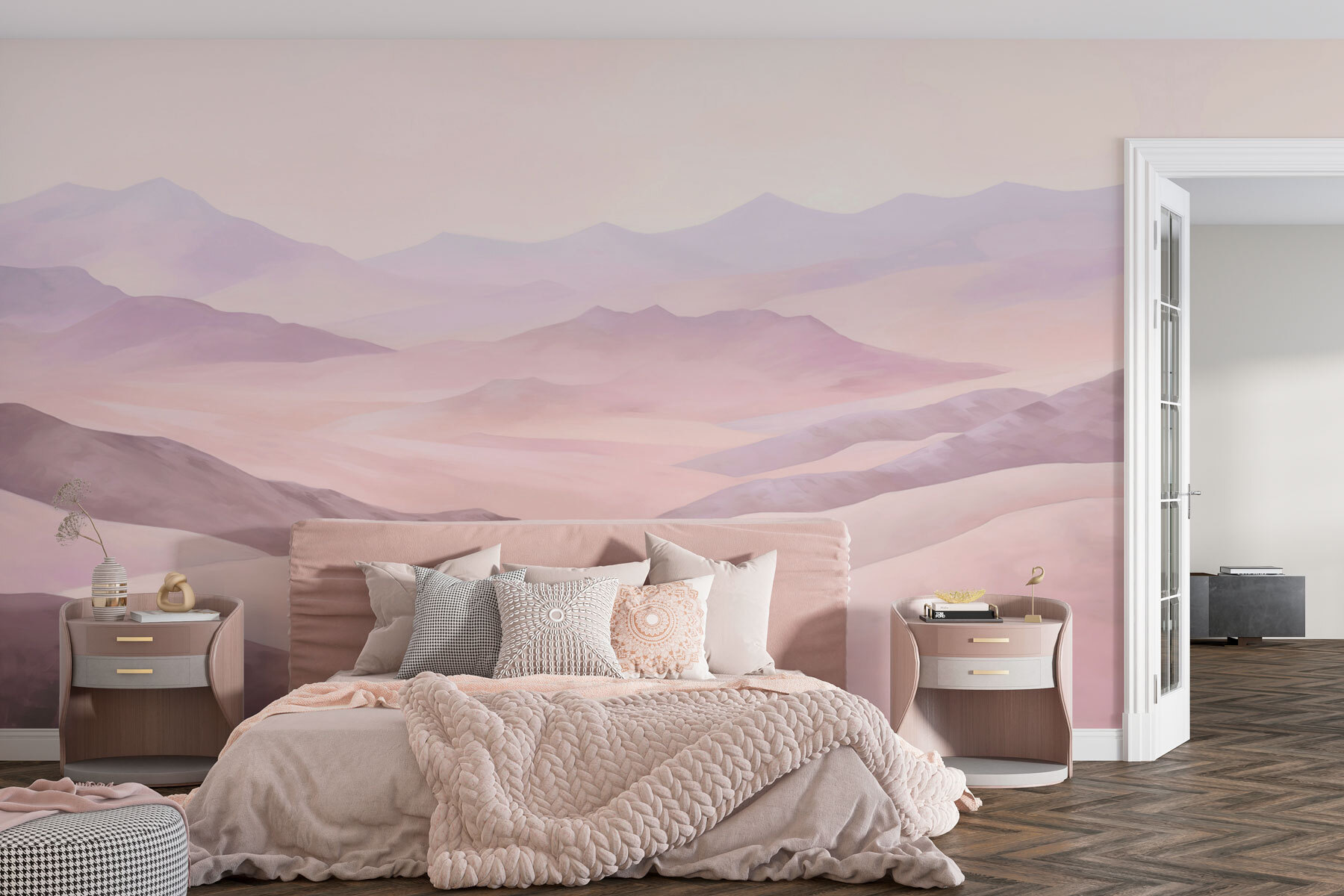Predstavte si, že ležíte vo svojom obľúbenom kresle a pozeráte na úžasnú akvarelovú fresku, ktorá sa valí po stene ako jemná, zasnená krajina. Je to viac než len pekné kopce a tiché hory – je to, akoby sa príroda rozhodla prísť do interiéru na kus reči. Ideálna pre každého, kto sníva o úteku do pokojných, široko otvorených priestorov bez toho, aby musel opustiť svoju obývačku. Jemné, tlmené farby prinášajú upokojujúcu atmosféru a zabalia vás do útulného, malebného objatia. Či už snívate, alebo drieme, táto nástenná maľba vám kryje chrbát!