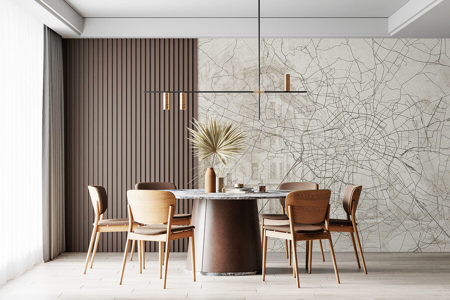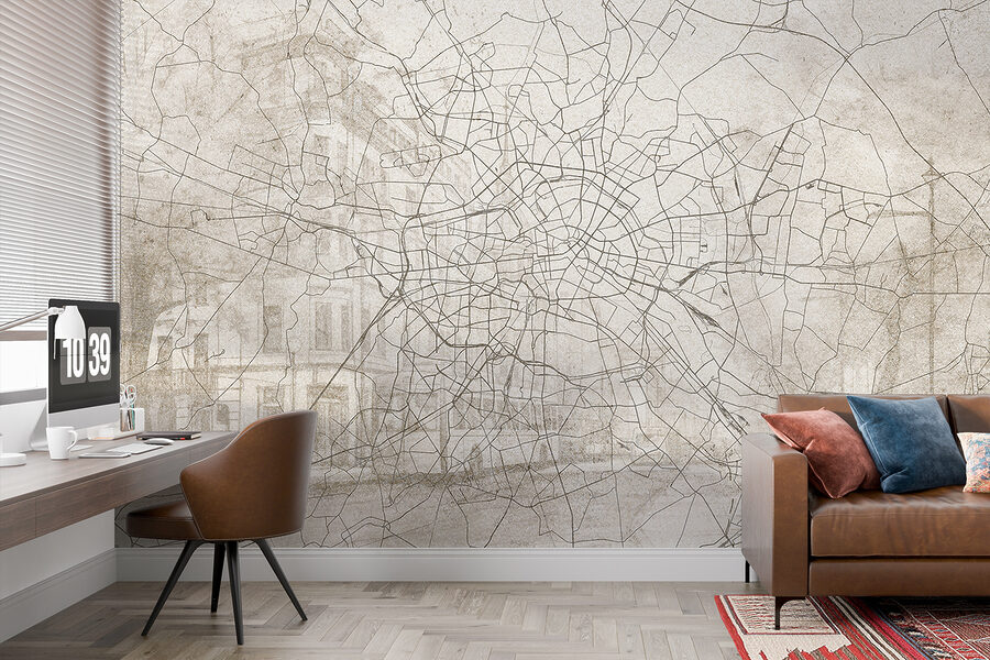 Predstavte si, že vojdete do miestnosti a privíta vás zložitá nástenná mapa, ktorá odhaľuje tajomstvá mesta. Je to ako pohľad z vtáčej perspektívy bez toho, aby ste museli opustiť gauč. Táto nástenná maľba rozpráva príbehy o kľukatých cestách a skrytých chodníkoch, akoby ste boli novodobým objaviteľom – bez pľuzgierov. Zemité tóny sa dokonale prelínajú a je v nich cítiť nádych nostalgie zmiešanej s dobrodružstvom. Ideálne pre snílkov a tulákov, ktorí majú radi dobré túlavé sny. Určite vyvolá rozhovory – každý sa rád “stratí” v dobrej mape!