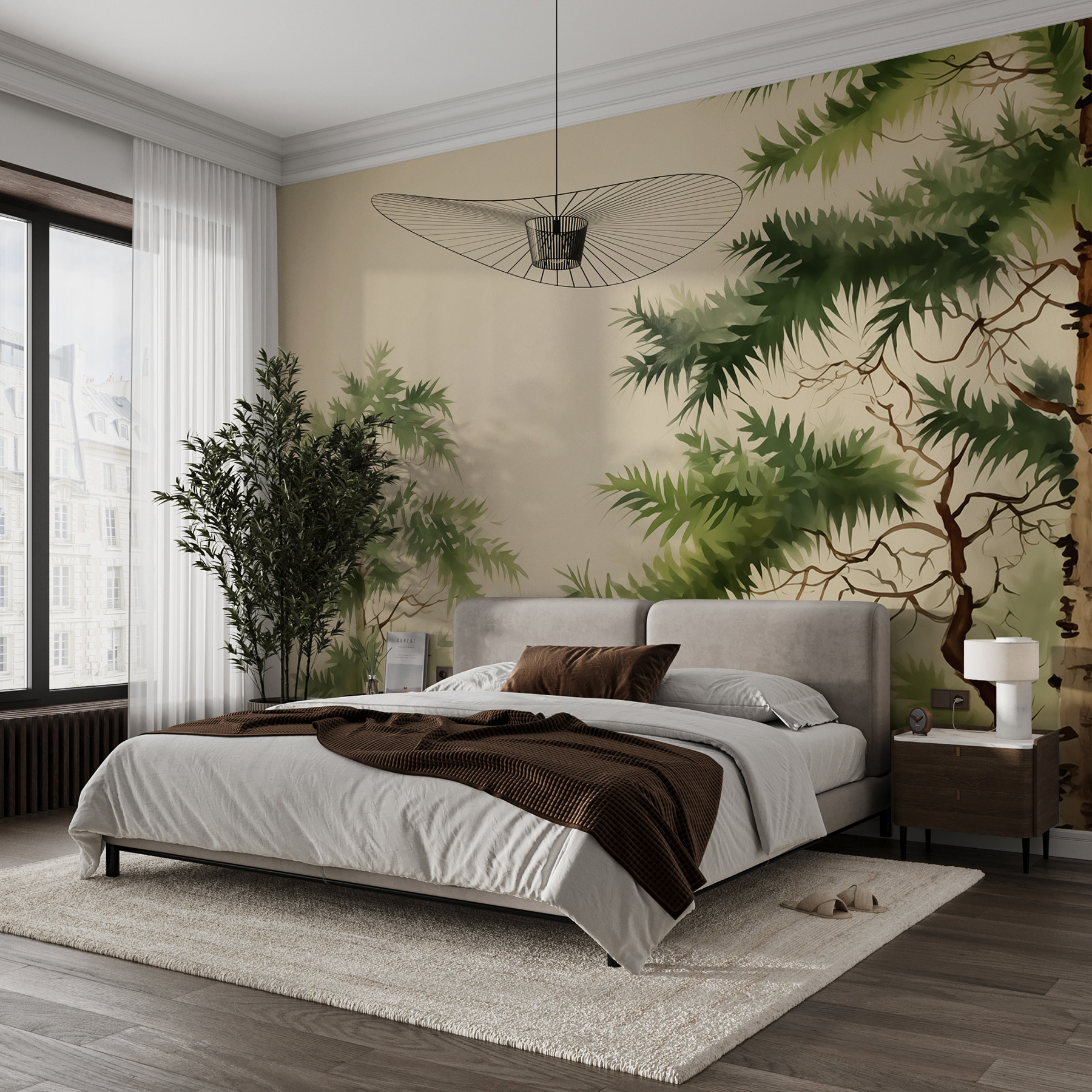 Predstavte si, že sa každý deň prebúdzate do jemného lesa – bez potreby lesných zvierat! Táto nástenná maľba s príznačným názvom “Nástenná maľba stromov a hmly” vás zabalí do mäkkého, hmlistého objatia. Je to ako pokojný únik, kde vás zhon nemôže nájsť. V miestnosti odetej do týchto zasnených stromov je vzduch sviežejší, takmer akoby ste sa delili o tajomstvá s prastarými lesmi. Ideálne na relaxáciu po dlhom dni. Kto by povedal, že pokoj môže visieť na stene? Navyše je to lepšie ako údržba rastliny v kvetináči.