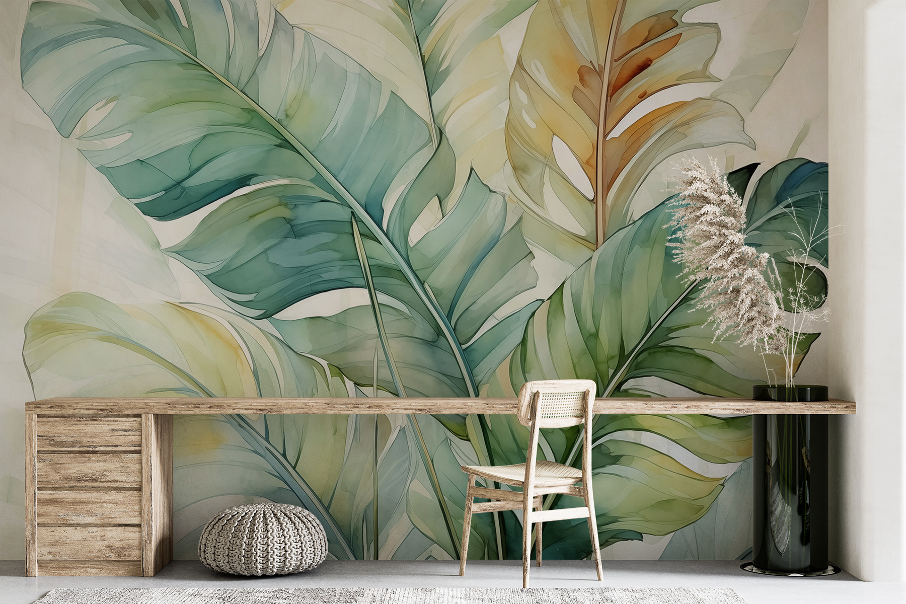 Predstavte si, že vstúpite do miestnosti, ktorá pôsobí ako svieži akvarelový sen. Táto nástenná maľba “Tropické listy” okamžite navodí pocit pokoja a rozmarnosti vďaka jemným ťahom štetca a nežnej zeleni. Ideálny pre milovníkov prírody alebo pre každého, kto potrebuje pokojný únik bez toho, aby musel opustiť domov. Je to ako dať svojim stenám botanické objatie! Či už ide o obývaciu izbu, spálňu alebo malý kútik, ktorý ste chceli vyzdobiť, táto nástenná maľba vám kryje chrbát. Dodá vám nádych tropov – bez pásmovej choroby!