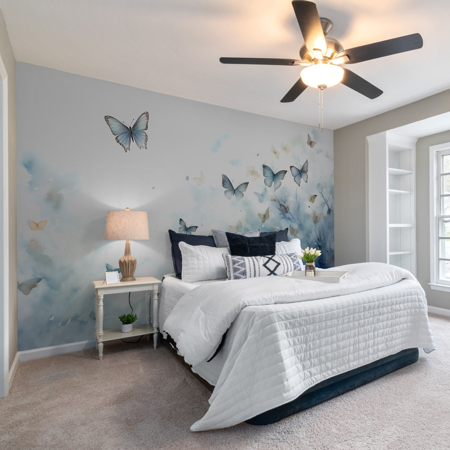 Predstavte si, že vstúpite do sveta, kde motýle ladne tancujú na akvarelovej oblohe – znie to snovo, však? Táto nástenná maľba prinesie do vášho priestoru presne takúto atmosféru. Je to ako mať v interiéri kúsok prírodného umenia. Jemná modrá a nežné poletuchy vytvárajú pokojnú, očarujúcu atmosféru. Ideálna pre chvíle, keď si chcete len tak sadnúť a nechať svoju myseľ blúdiť. Predstavte si daždivé popoludnie, šálku čaju v ruke a tieto motýle dodávajúce kúzlo. Je to ako denné snenie, priamo na vašej stene.