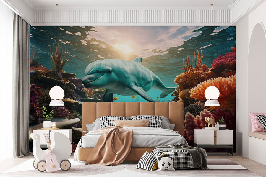 Ponorte sa do kvapky pokoja s touto nástennou maľbou s delfínom, ktorý pokojne pláva v žiarivom oceáne. Predstavte si to – steny sa premenia na zasnený podmorský únik, ktorý žije farebnými koralmi a veselými rybami. Je to ako mať okno do žiarivého, pokojného oceánu priamo u vás doma. Priatelia sa určite zastavia a budú sa pozerať, či nevstúpili do akvária. Len si predstavte, že sa prebúdzate pri tejto úžasnej scéne a každý deň sa cítite o niečo uvoľnenejšie. Nie je to len dekorácia, je to každodenné dobrodružstvo, ktoré na vás čaká. Táto nástenná maľba, ktorá je ideálna na dotvorenie bezstarostnej prímorskej atmosféry, prináša do každého priestoru slnko a radosť!