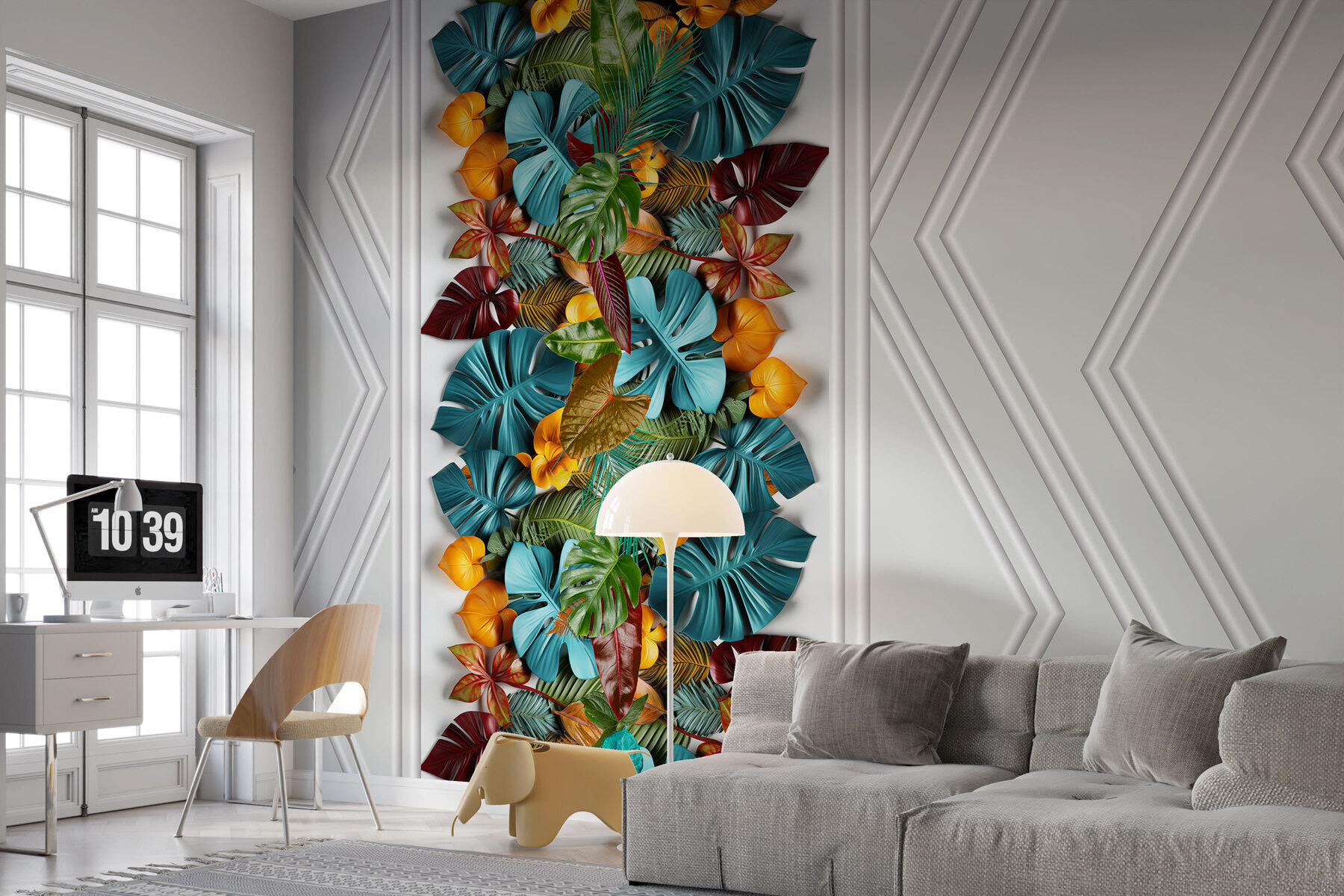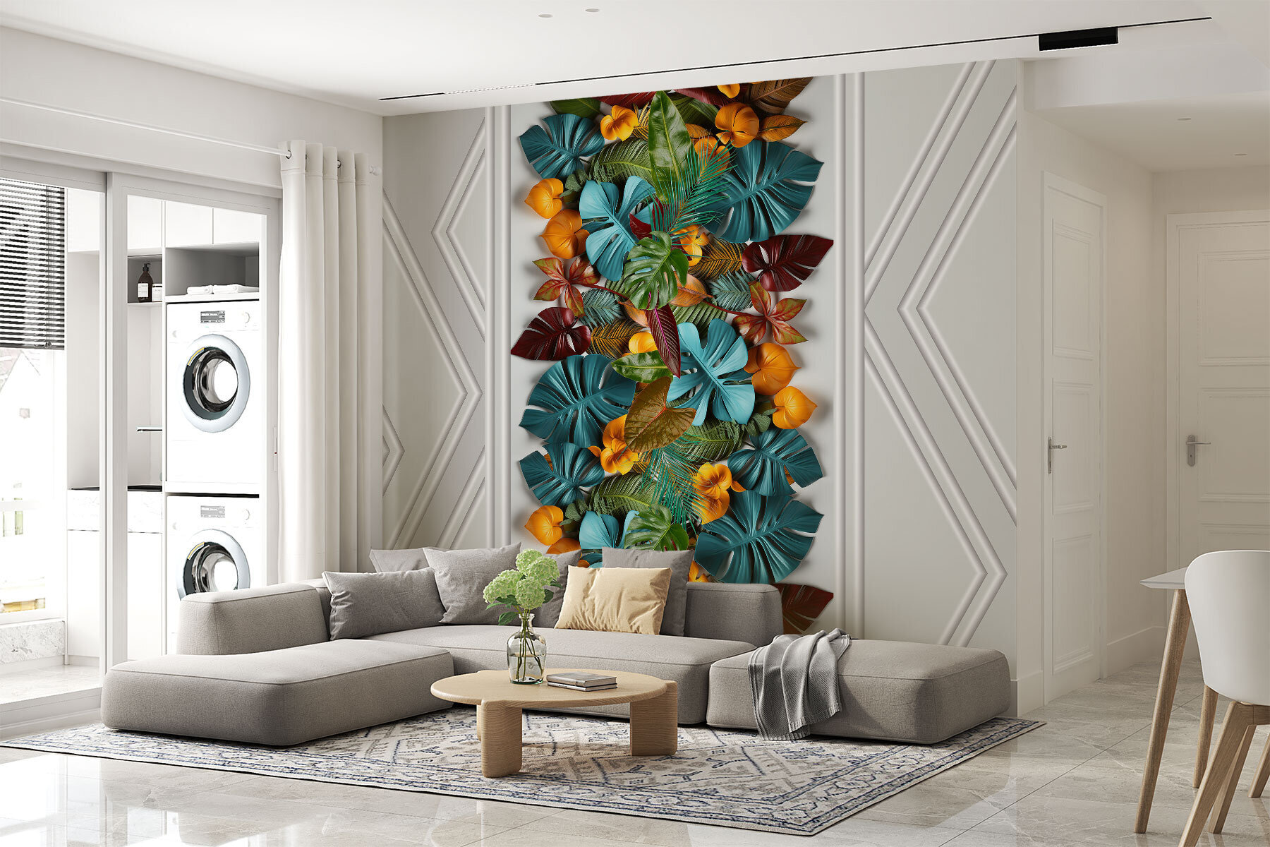 Premeňte každú miestnosť pomocou tejto očarujúcej nástennej maľby s bielymi dverami obklopenými pestrofarebnými listami. Je to ako preniesť slnečnú tropickú dovolenku priamo do vášho priestoru! Predstavte si, že sa každé ráno prebúdzate do živej džungle – tieto živé zelené a oranžové farby určite vyvolajú radosť a možno aj trochu snenia. Ideálny do obývacej izby alebo domácej kancelárie, vytvára hravé pozadie, ktoré je relaxačné a zároveň dodáva energiu. Predstavte si, ako hostíte priateľov a počúvate ich, ako básnia o vašej jedinečnej výzdobe. Kto by sa nechcel vyhrievať v takejto sviežej atmosfére? Ide o tú pravú atmosféru úteku bez toho, aby ste museli opustiť domov!