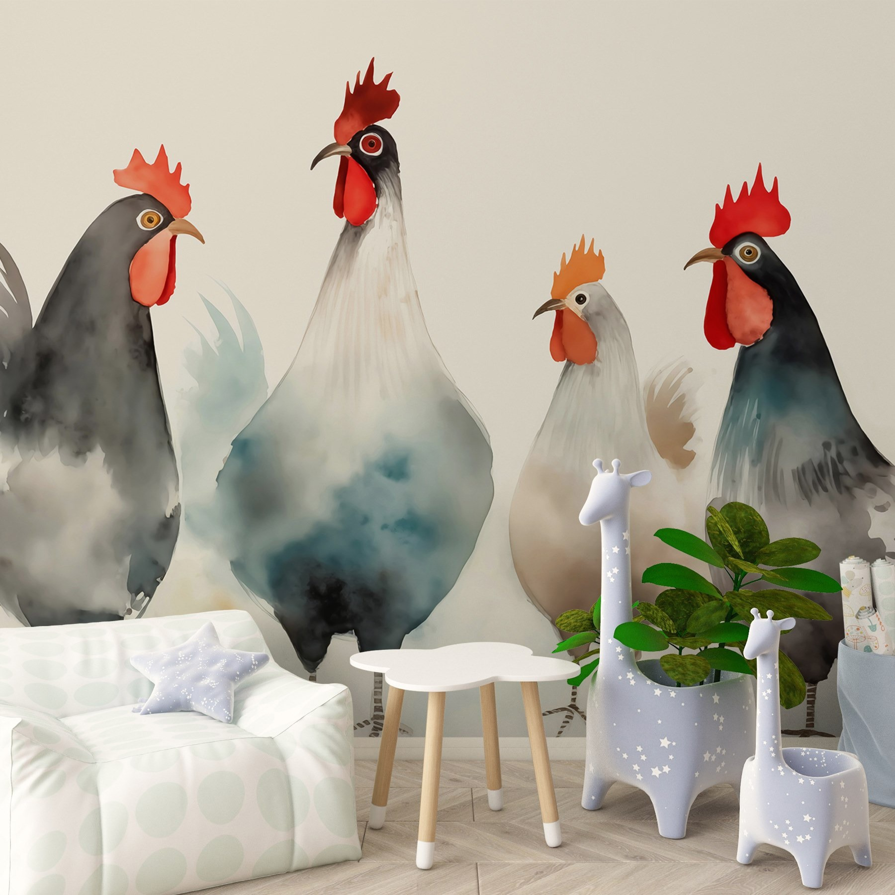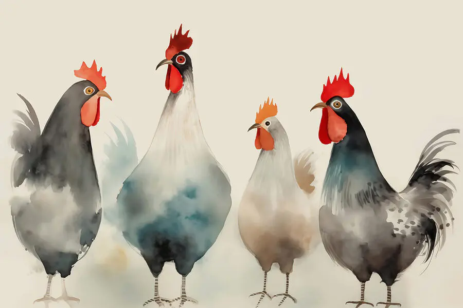 Rozžiarte každý priestor touto rozkošnou nástennou maľbou s bizarnou skupinou sliepok, ktoré sa pýšia červeným a bielym perím, akoby práve vyšli z módneho móla. Ich živé osobnosti dodajú šmrnc humoru a premenia obyčajnú stenu na miesto, kde sa bude dať rozprávať. Predstavte si, že vojdete do miestnosti a privítajú vás títo operení priatelia – je to ako mať doma mini farmu! Táto nástenná maľba je ideálna do kuchyne, detskej izby alebo kdekoľvek, kde je potrebné trochu rozveseliť, pretože jej jemné farby a hravá atmosféra určite zahrejú pri srdci. Navyše, kto by sa neusmieval na kuraciu čatu? Je čas dobre privítať túto očarujúcu výzdobu!
