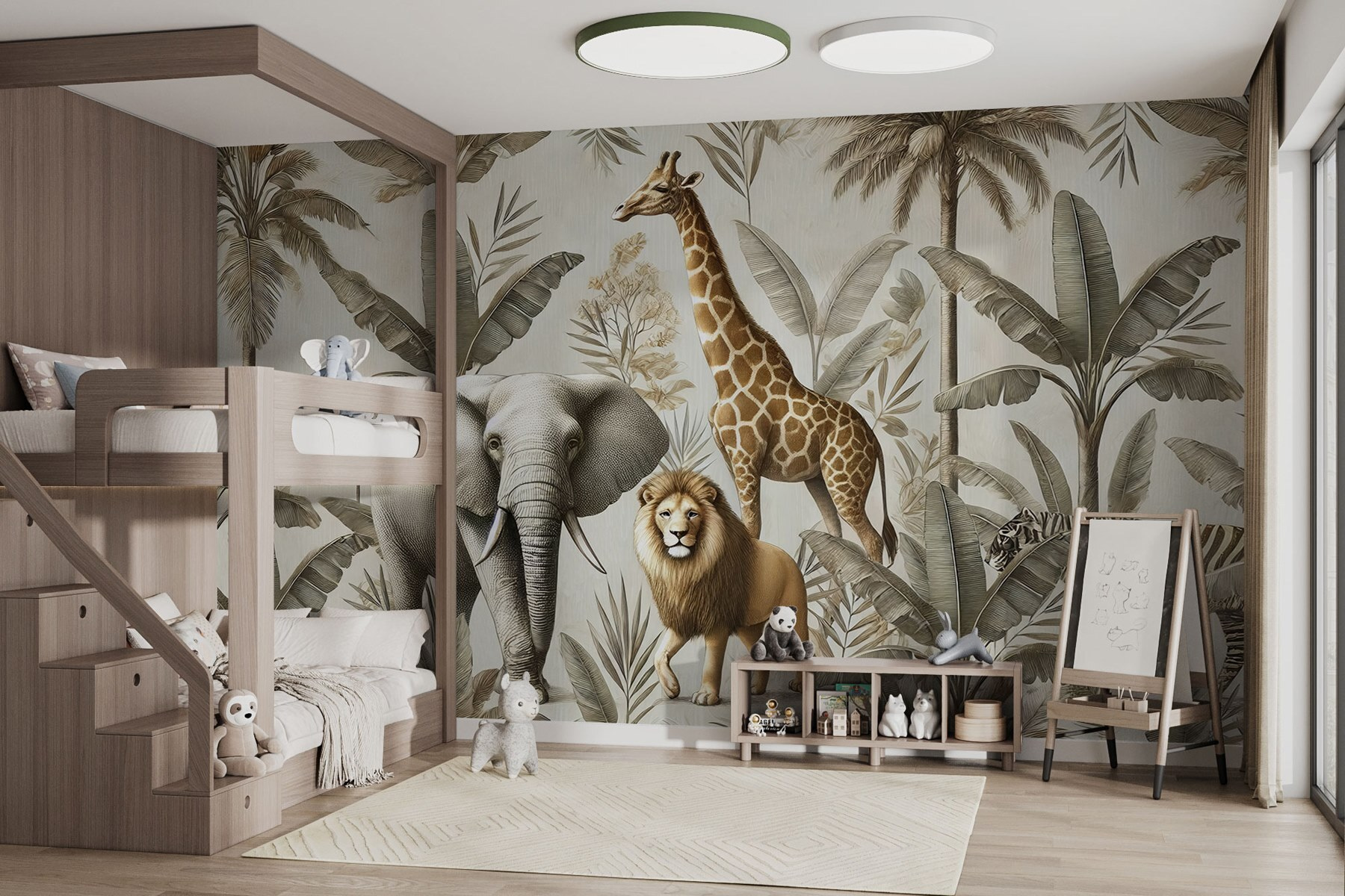 Premeňte svoj priestor na exotický únik s touto úžasnou nástennou maľbou so živou scénou džungle. Predstavte si odvážneho slona, kráľovskú žirafu a majestátneho leva, ktorí sa zdržiavajú uprostred bujných rastlín a paliem – ako by sa nejaká miestnosť nemohla cítiť dobrodružnejšie? Je to ako preniesť si kúsok divočiny priamo do svojho domova. Rodina a priatelia sa pri popíjaní kávy budú radi rozprávať o divokom tigrovi číhajúcom v zeleni. Navyše teplé, zemité tóny vytvárajú upokojujúcu atmosféru, ktorá je ideálna na relaxáciu alebo načerpanie inšpirácie. Táto nástenná maľba nie je len dekoráciou, je to malé dobrodružstvo, ktoré čaká na to, aby sa stalo!