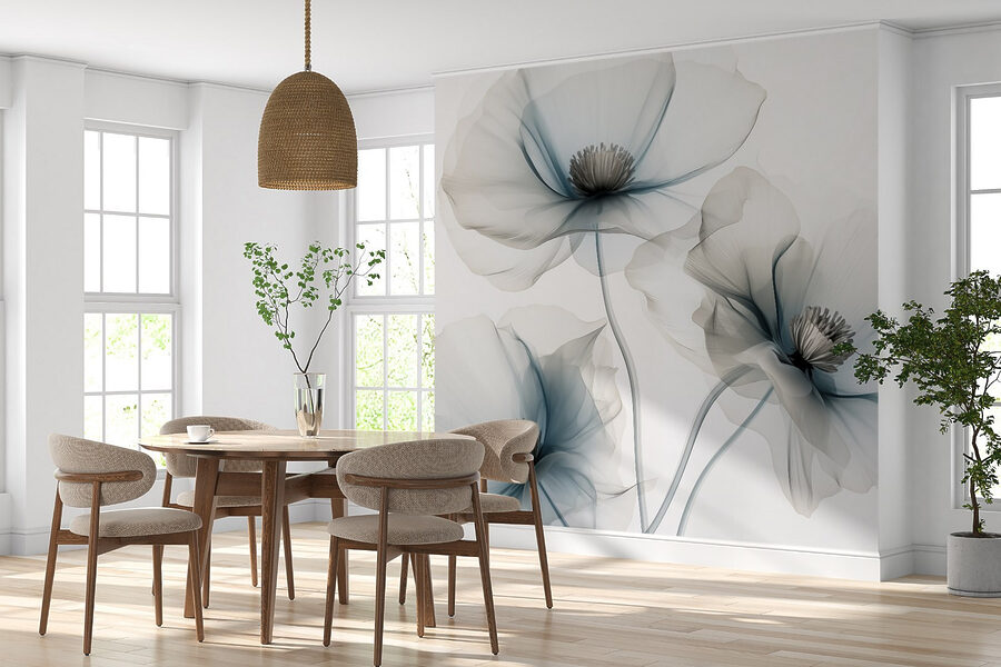 Premeňte akúkoľvek miestnosť na pokojné útočisko s touto nádhernou nástennou maľbou s jemnými kvetmi v jemných svetlomodrých odtieňoch. Šepká eleganciu a pokoj a pozýva vás do pokojného útočiska. Predstavte si, ako popíjate kávu a vyhrievate sa v žiari ranného svetla, zatiaľ čo tieto nádherné kvety tancujú na vašich stenách. Zachytávajú podstatu prírody takým jemným spôsobom – ideálne na dni, keď sa svet zdá byť príliš hektický. Navyše je to elegantný spôsob, ako dodať priestoru farbu bez toho, aby ho zahltila. Nie je potrebná žiadna záhrada! Prijmite krásu a nechajte svoje steny rozprávať príbeh.